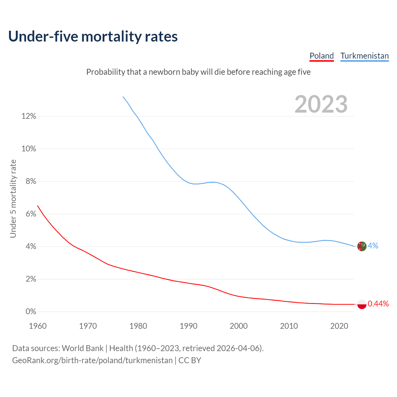 The chance that a newborn baby will die before reaching age five is 0.44% in Poland and 4% in Turkmenistan. Above is a chart with historical data on under-five mortality rates.