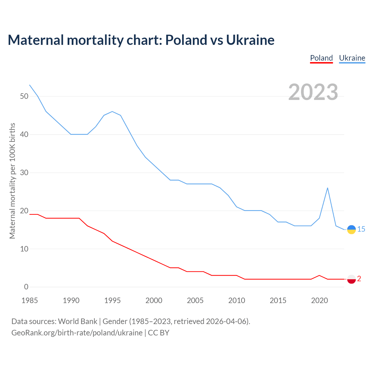 The maternal mortality rate, which is the probability of dying during childbirth or within 42 days of pregnancy termination, is 2 deaths per 100,000 live births in Poland, compared to 15 deaths in Ukraine.