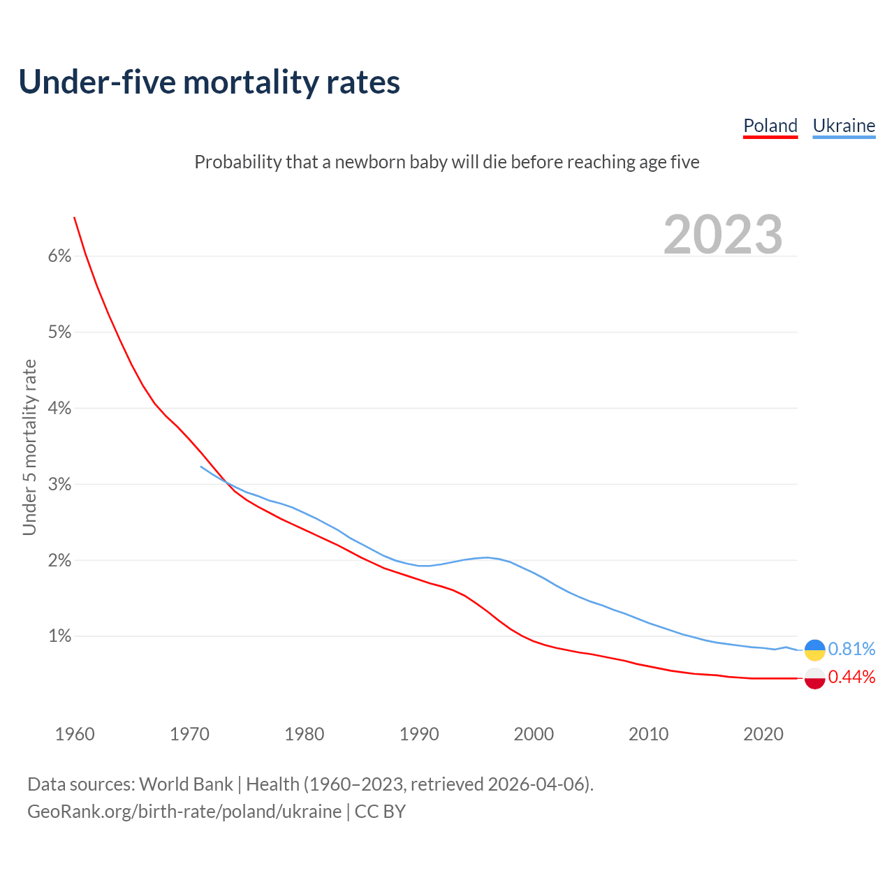 The chance that a newborn baby will die before reaching age five is 0.44% in Poland and 0.81% in Ukraine. Above is a chart with historical data on under-five mortality rates.