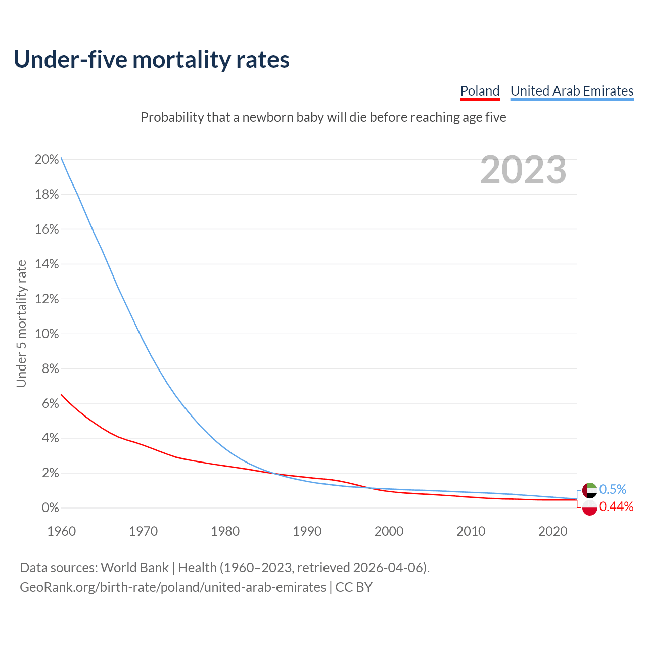 The chance that a newborn baby will die before reaching age five is 0.44% in Poland and 0.5% in the United Arab Emirates. Above is a chart with historical data on under-five mortality rates.
