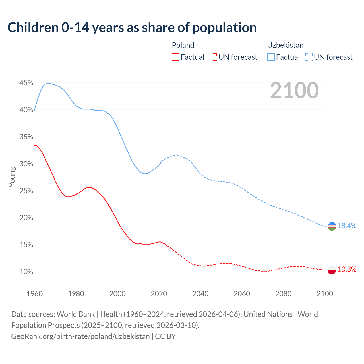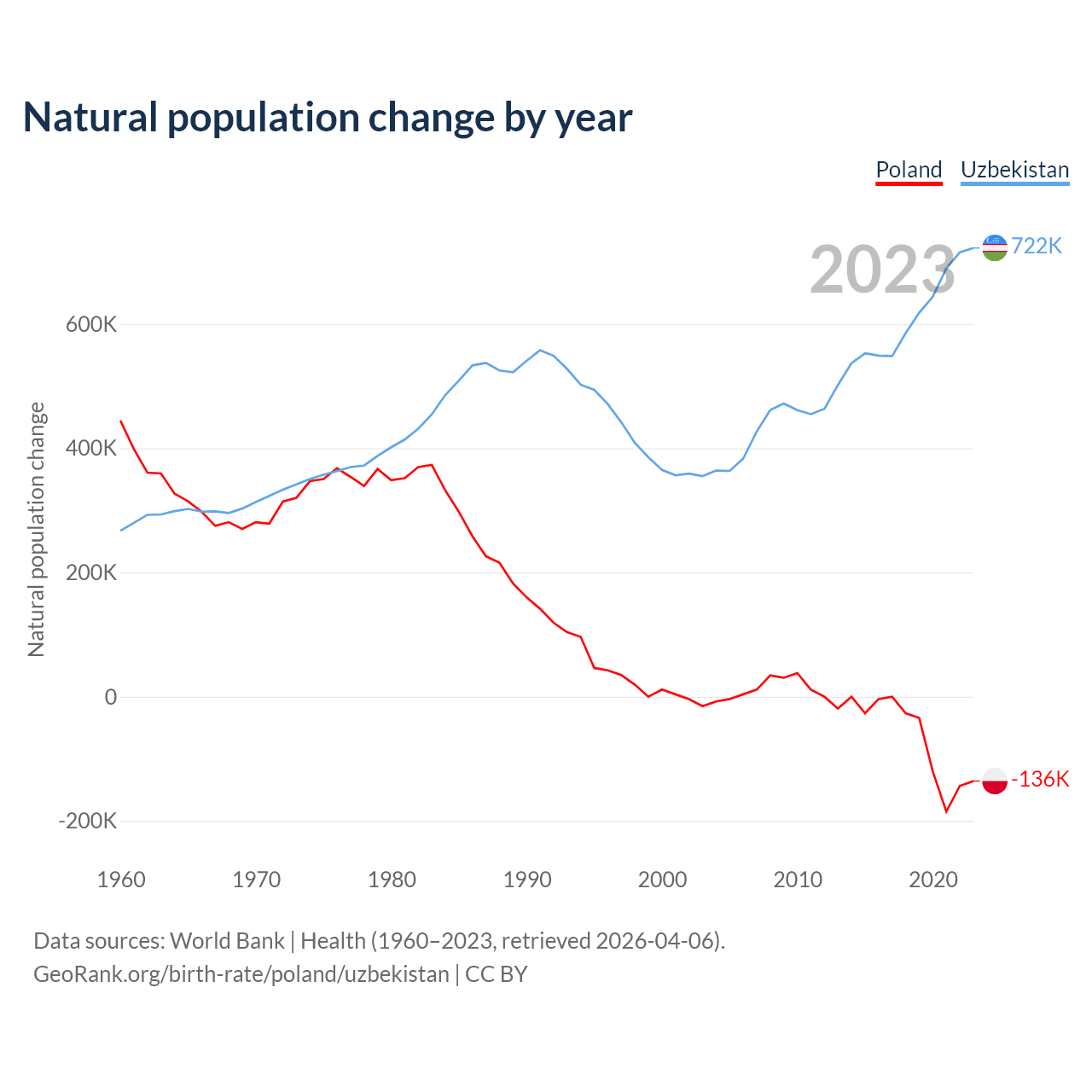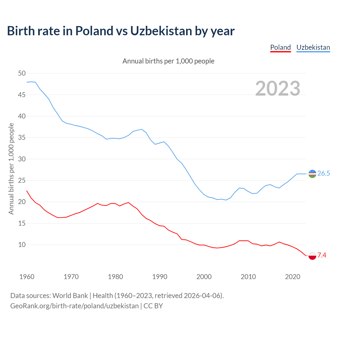 Poland has an annual birth rate of 7.4 births per 1,000 people, compared to 26.5 for Uzbekistan. The average number of children a woman is expected to have during her lifetime — the fertility rate, is 1.16 in Poland and 3.5 in Uzbekistan — 202.2% difference.