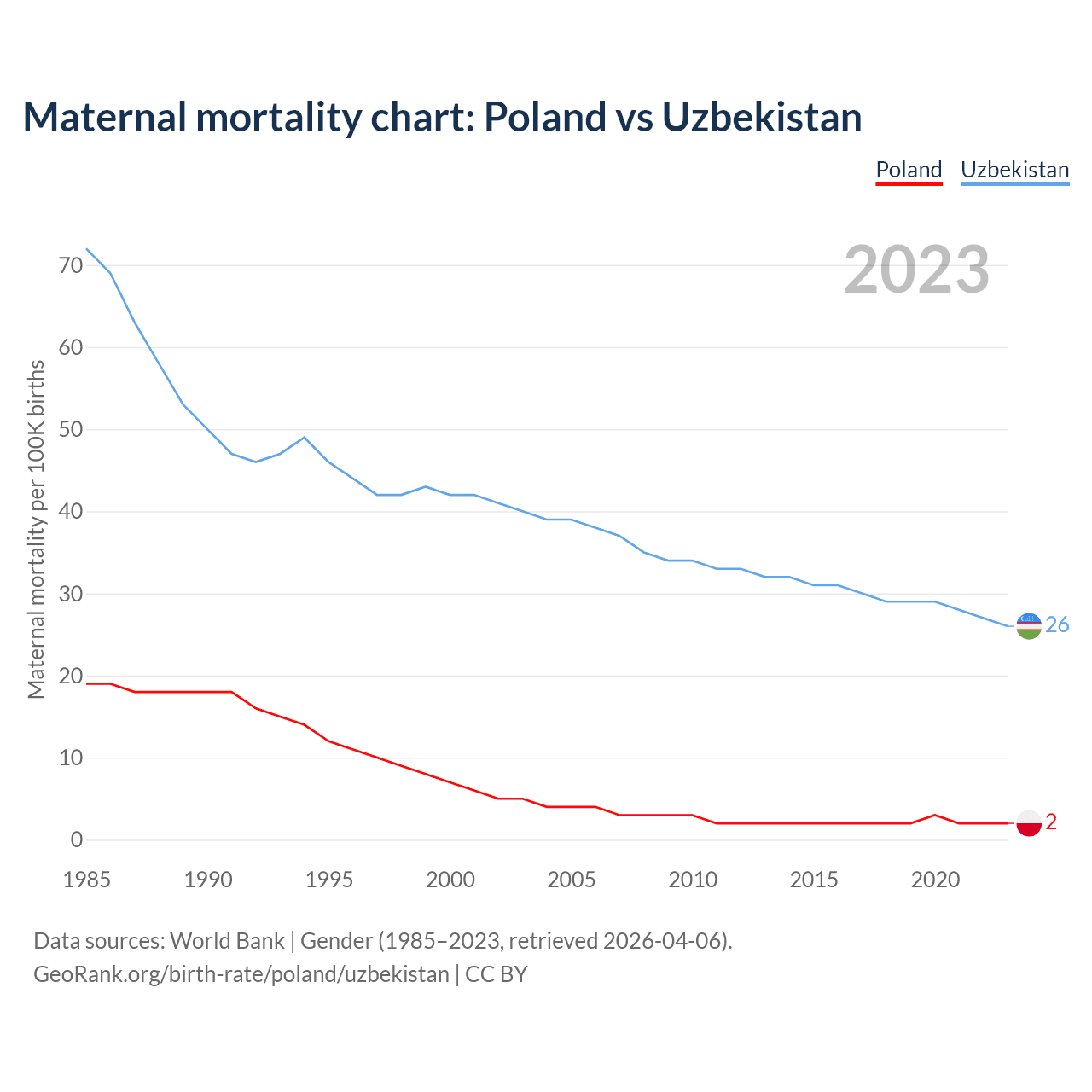 The maternal mortality rate, which is the probability of dying during childbirth or within 42 days of pregnancy termination, is 2 deaths per 100,000 live births in Poland, compared to 26 deaths in Uzbekistan.
