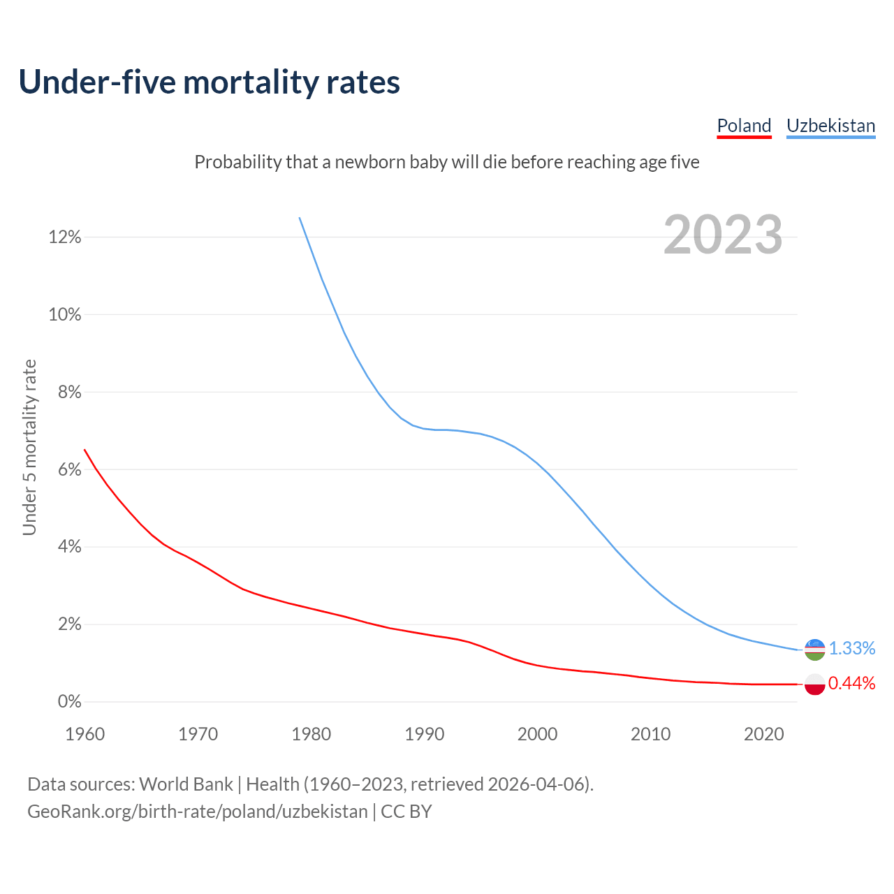 The chance that a newborn baby will die before reaching age five is 0.44% in Poland and 1.33% in Uzbekistan. Above is a chart with historical data on under-five mortality rates.