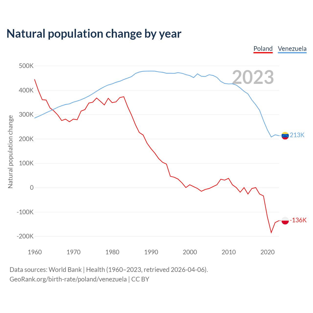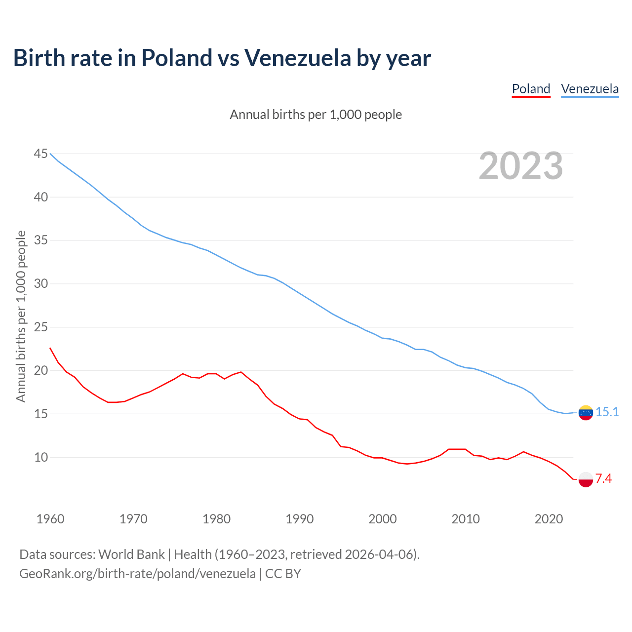 Poland has an annual birth rate of 7.4 births per 1,000 people, compared to 15.1 for Venezuela. The average number of children a woman is expected to have during her lifetime — the fertility rate, is 1.16 in Poland and 2.08 in Venezuela — 79.5% difference.