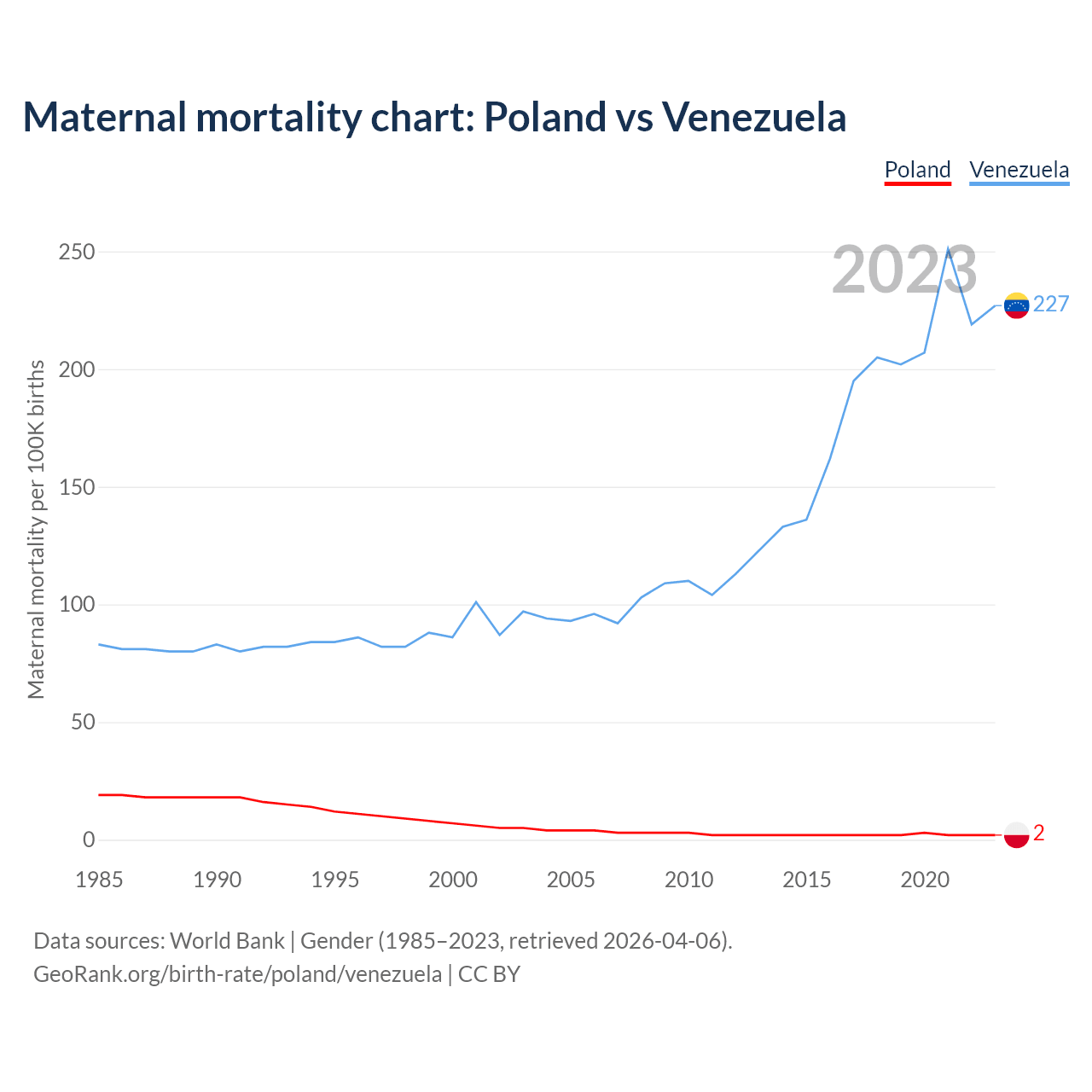 The maternal mortality rate, which is the probability of dying during childbirth or within 42 days of pregnancy termination, is 2 deaths per 100,000 live births in Poland, compared to 227 deaths in Venezuela.