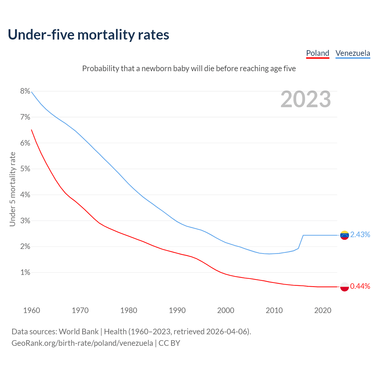 The chance that a newborn baby will die before reaching age five is 0.44% in Poland and 2.43% in Venezuela. Above is a chart with historical data on under-five mortality rates.