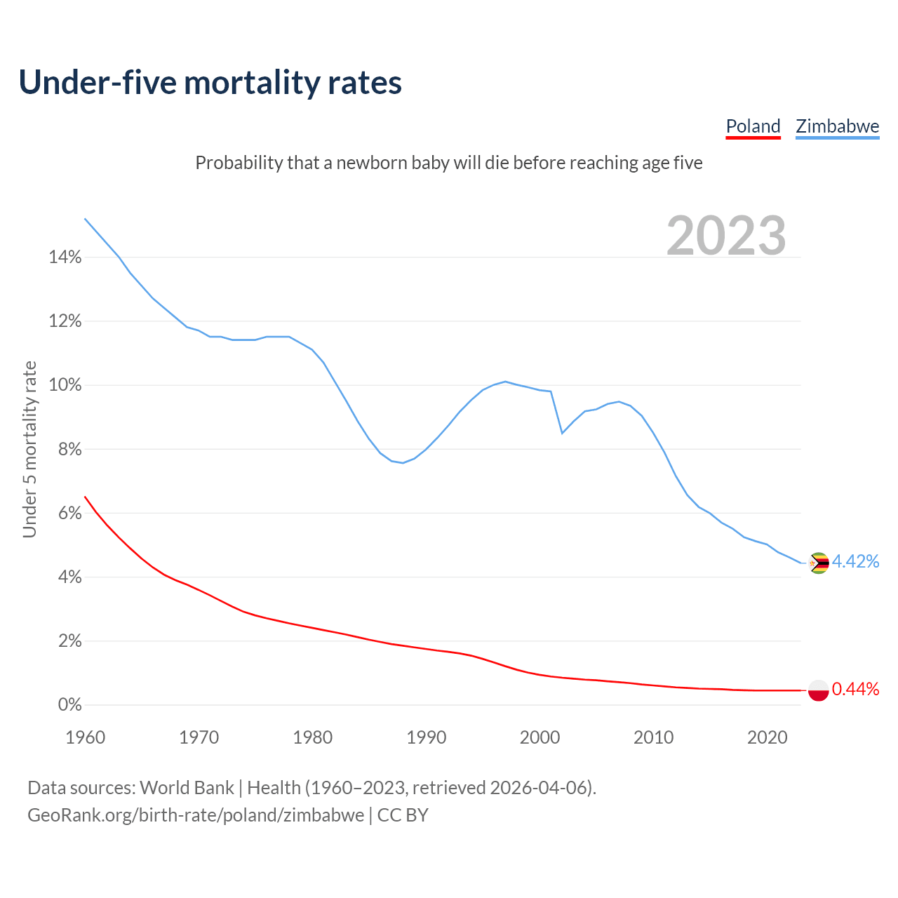 The chance that a newborn baby will die before reaching age five is 0.44% in Poland and 4.42% in Zimbabwe. Above is a chart with historical data on under-five mortality rates.