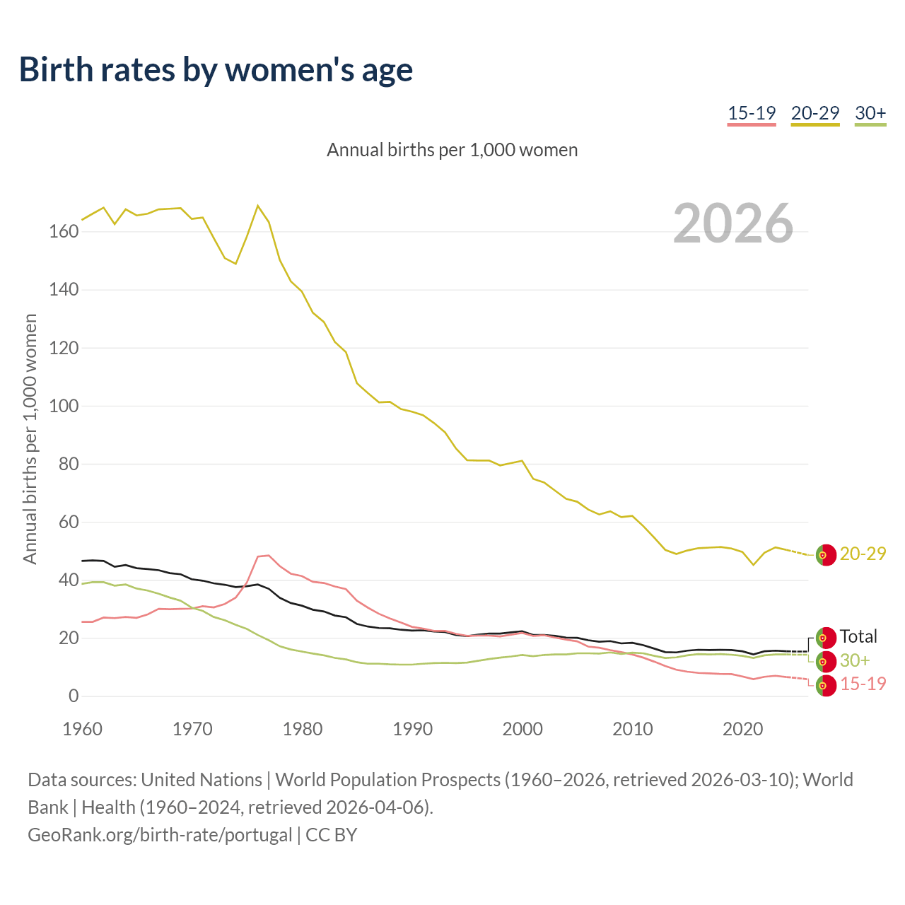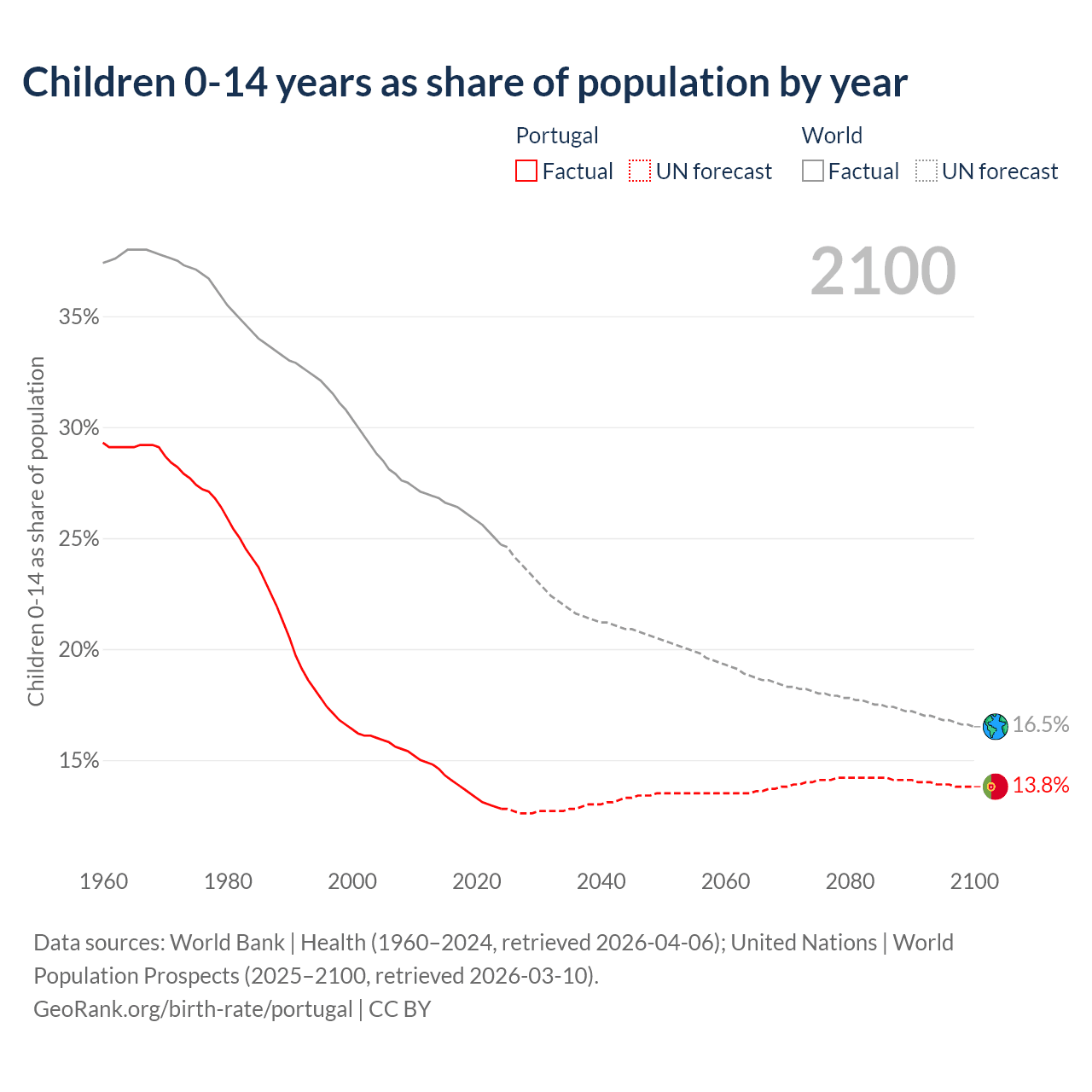 Portugal has a birth rate of 8.1 (annual births per 1,000 people) and a fertility rate of 1.44 (the average number of children a woman is expected to have over her lifetime based on current age-specific birth rates).