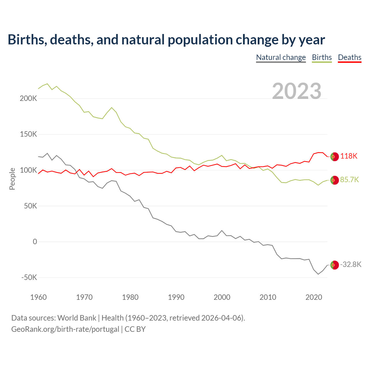 According to the latest birth rate data available, the fertility rate in Portugal was 1.44 in 2023 and has been below the replacement level of 2.1 children per woman since 1982. In 1993, the fertility rate was 1.52 — a 5.26% decline in 30 years.