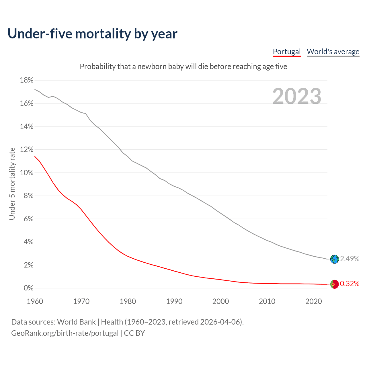 The under-5 mortality rate in Portugal was 3.2 deaths per 1,000 live births in 2023 — a 0.32% chance that a newborn baby will die before reaching age five. This is down from 7.2 deaths per 1,000 live births in 2000.