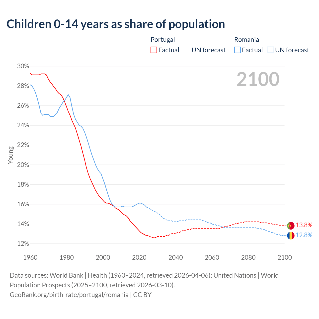 Portugal has an annual birth rate of 8.1 births per 1,000 people, compared to 8 for Romania. The average number of children a woman is expected to have during her lifetime — the fertility rate, is 1.44 in Portugal and 1.71 in Romania — 18.8% difference.