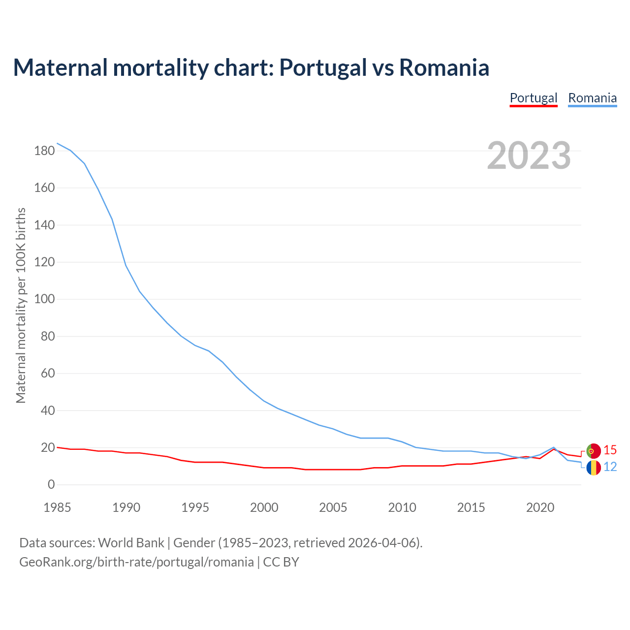 The maternal mortality rate, which is the probability of dying during childbirth or within 42 days of pregnancy termination, is 15 deaths per 100,000 live births in Portugal, compared to 12 deaths in Romania.