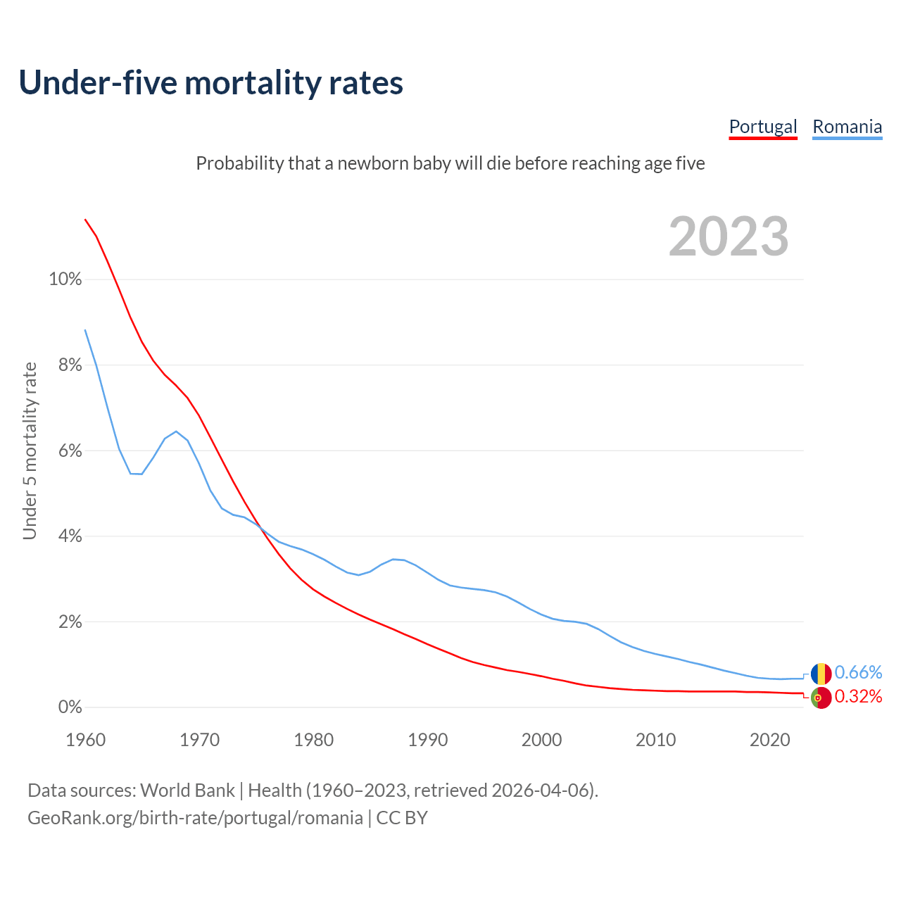 The chance that a newborn baby will die before reaching age five is 0.32% in Portugal and 0.66% in Romania. Above is a chart with historical data on under-five mortality rates.