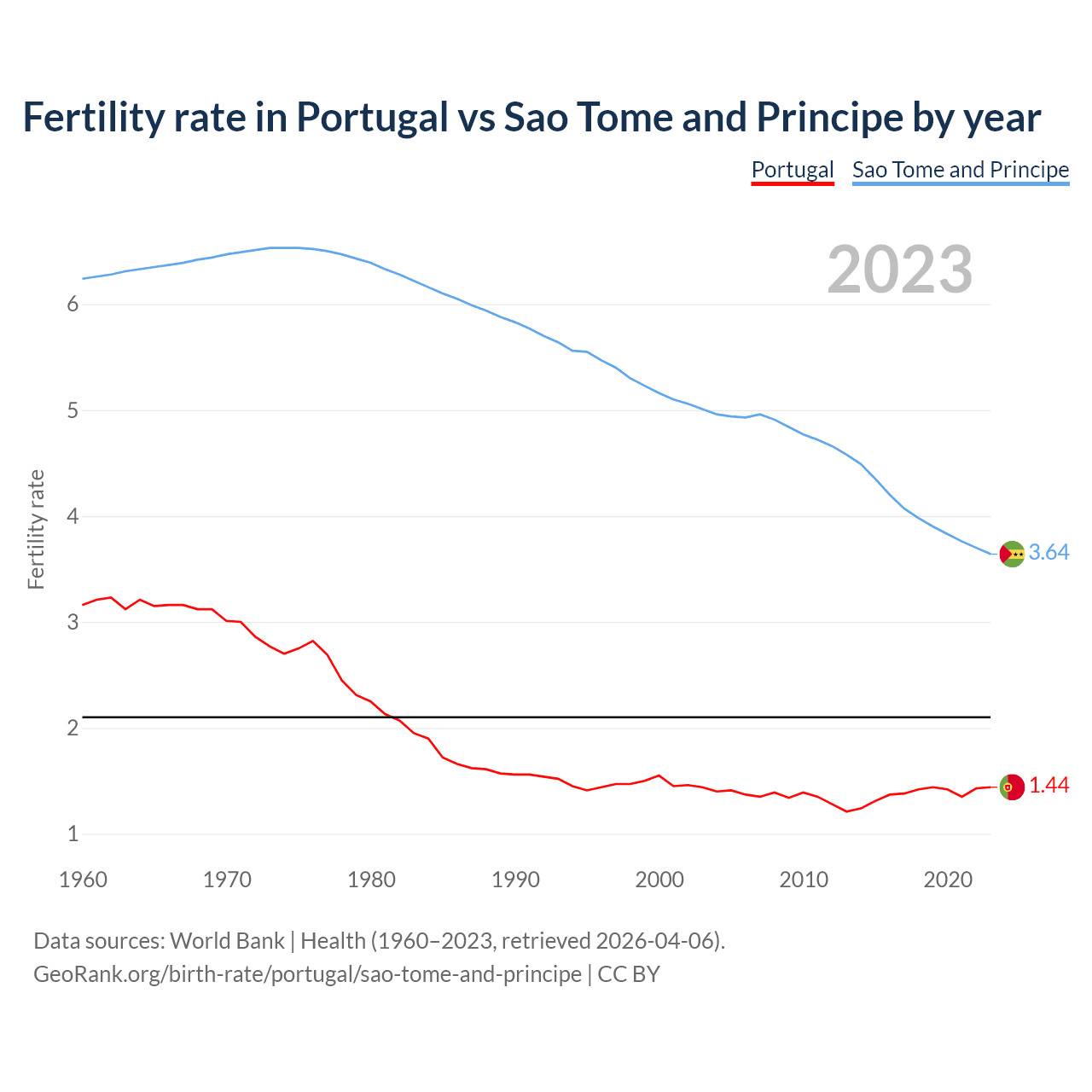 1960 vs 2023, the fertility rate has decreased by 54.4% in Portugal and by 41.6% in Sao Tome and Principe — in 1960, it was 3.16 and 6.24, respectively.