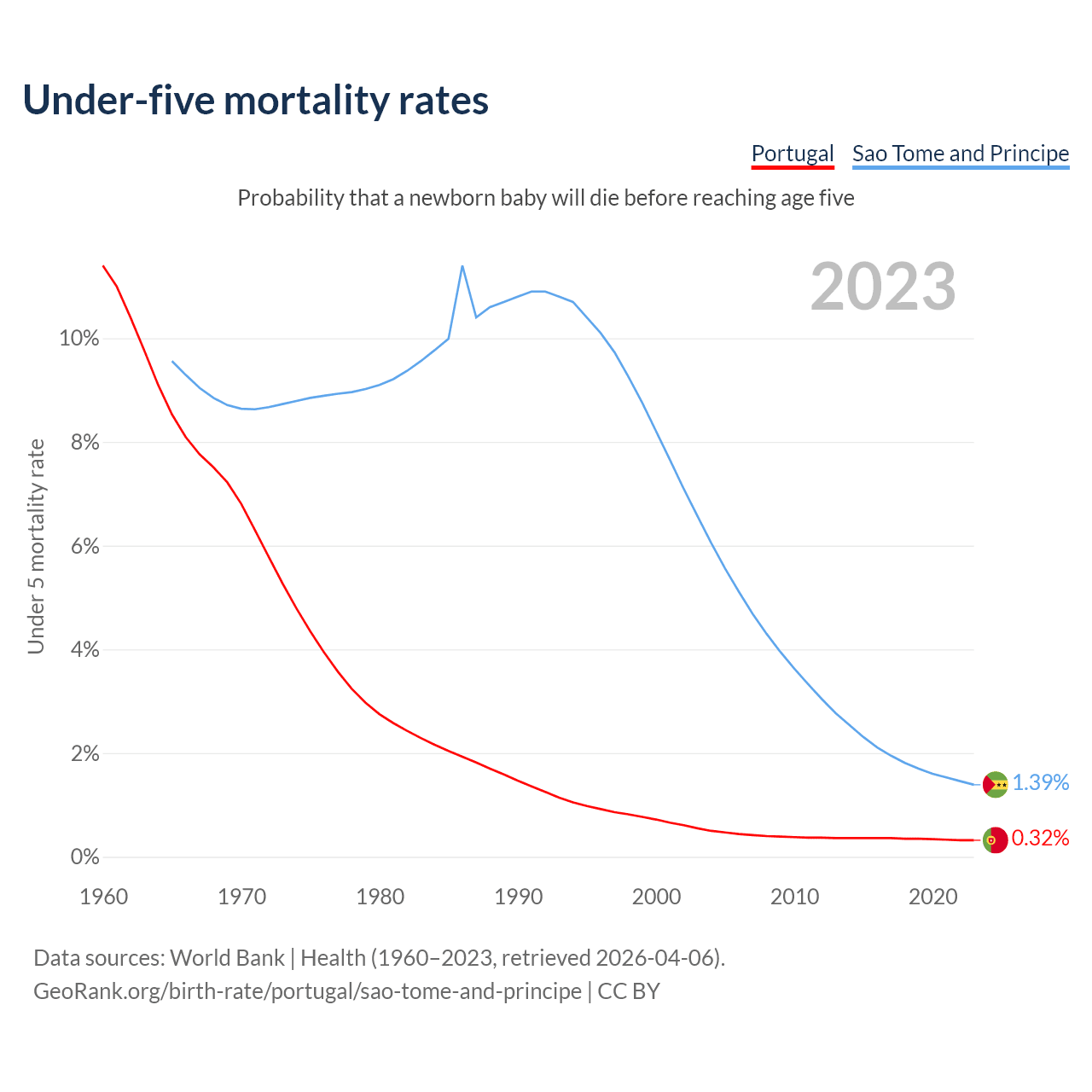 The chance that a newborn baby will die before reaching age five is 0.32% in Portugal and 1.39% in Sao Tome and Principe. Above is a chart with historical data on under-five mortality rates.