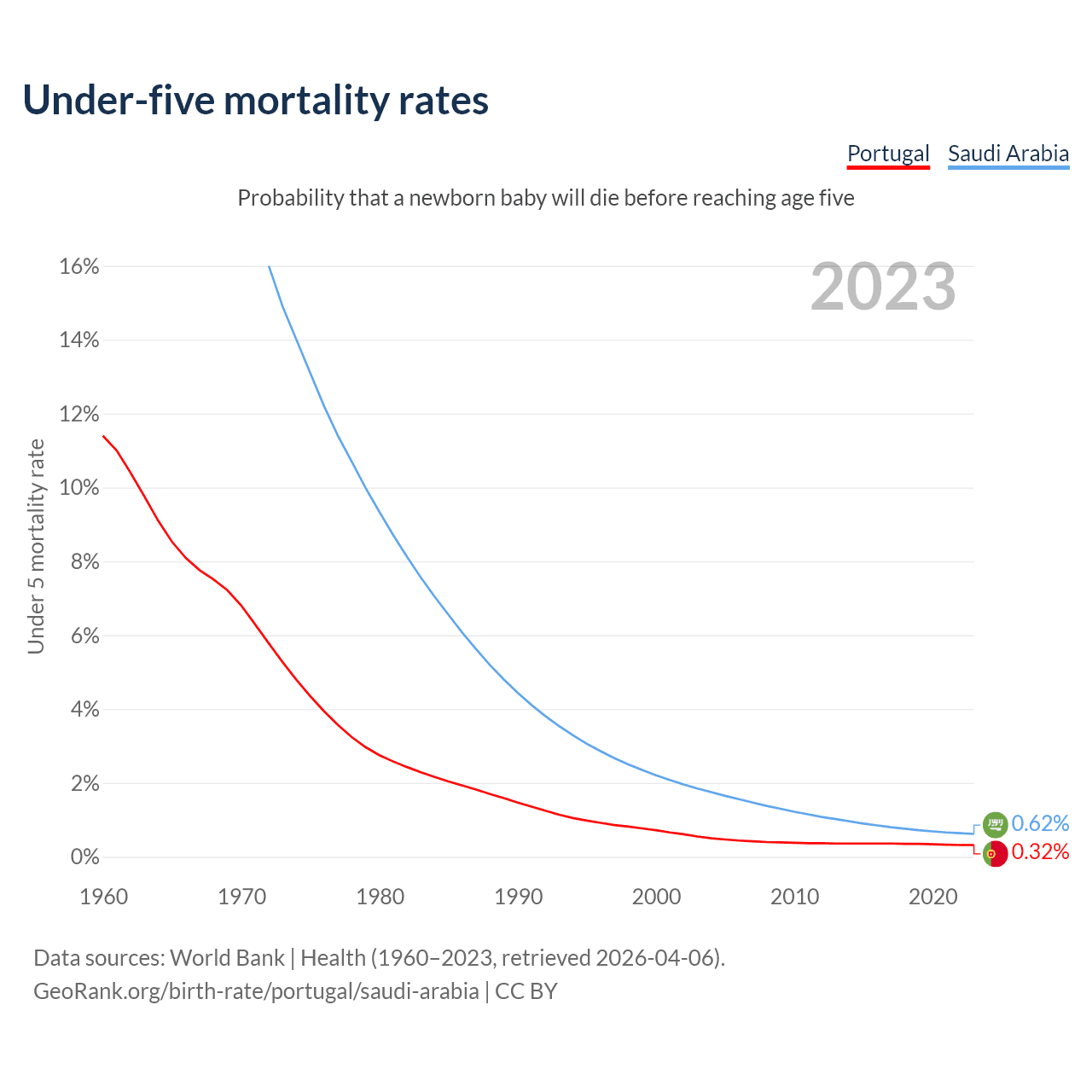 The chance that a newborn baby will die before reaching age five is 0.32% in Portugal and 0.62% in Saudi Arabia. Above is a chart with historical data on under-five mortality rates.