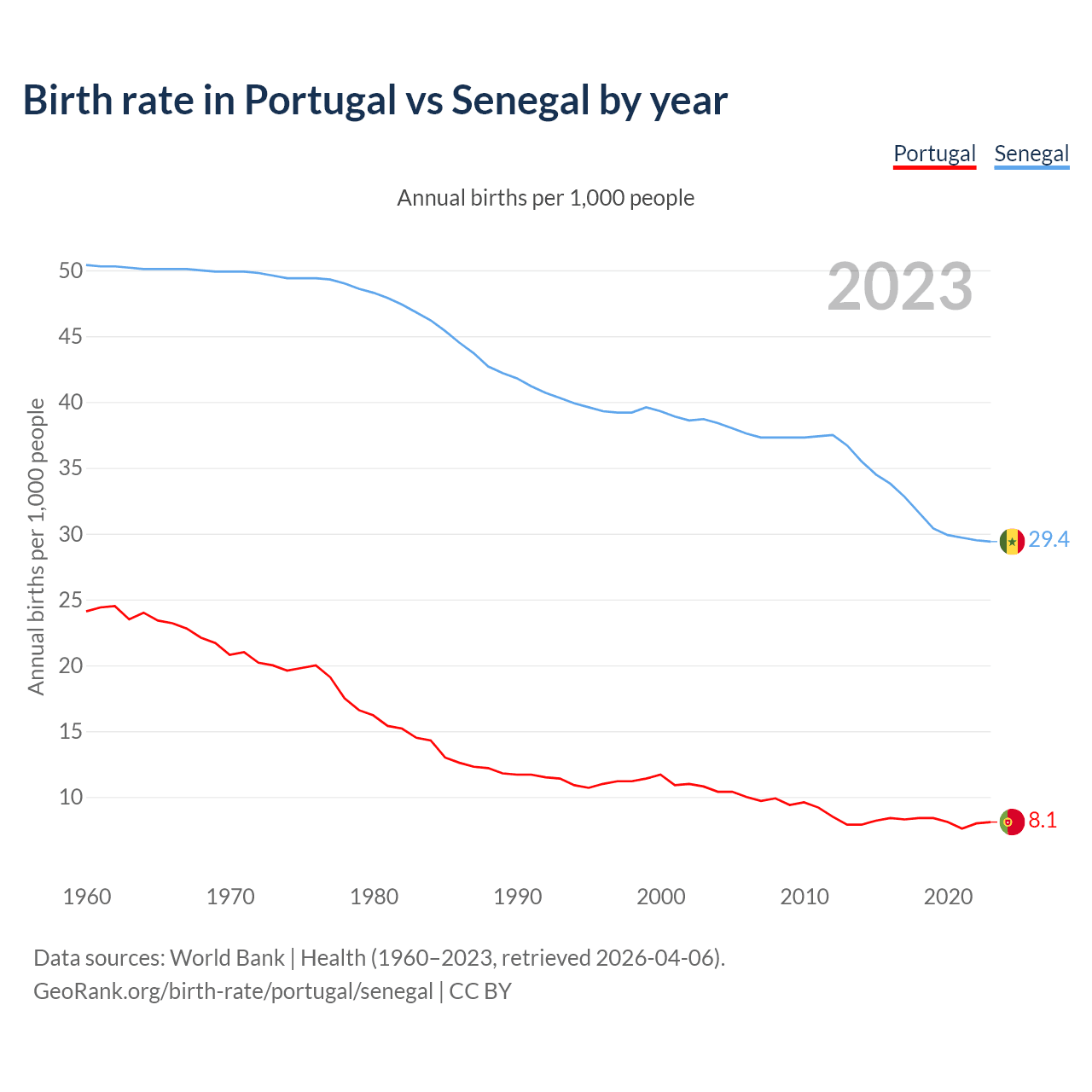 Portugal has an annual birth rate of 8.1 births per 1,000 people, compared to 29.4 for Senegal. The average number of children a woman is expected to have during her lifetime — the fertility rate, is 1.44 in Portugal and 3.82 in Senegal — 165.1% difference.