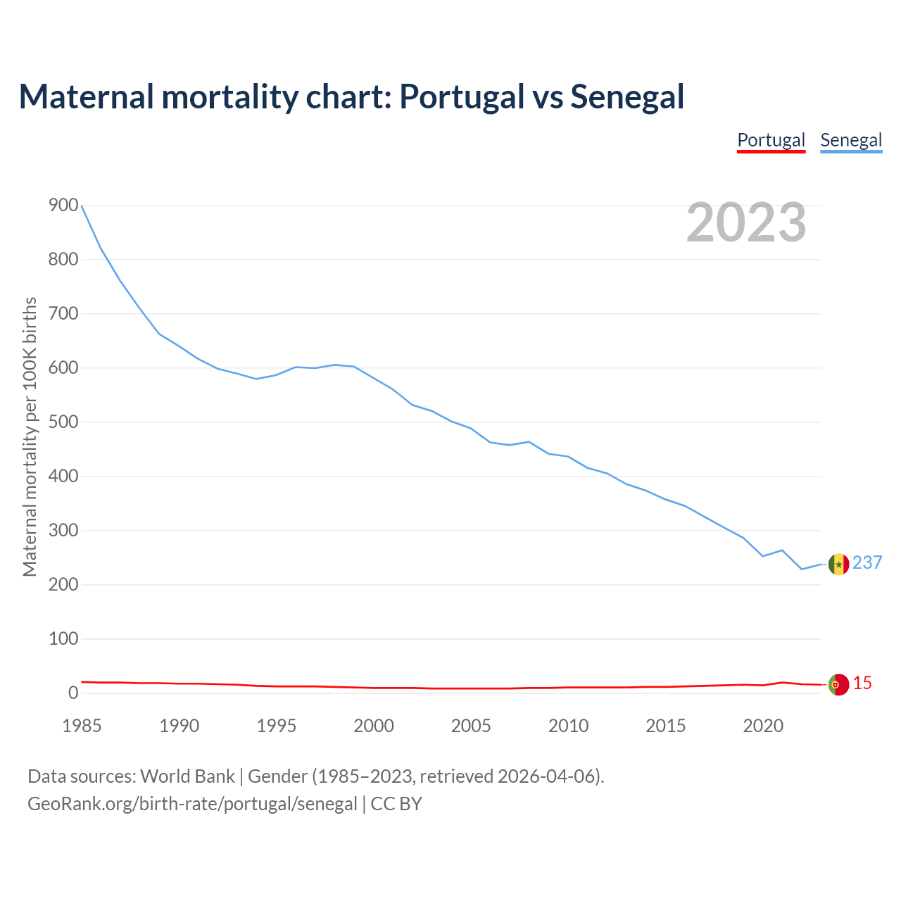 The maternal mortality rate, which is the probability of dying during childbirth or within 42 days of pregnancy termination, is 15 deaths per 100,000 live births in Portugal, compared to 237 deaths in Senegal.
