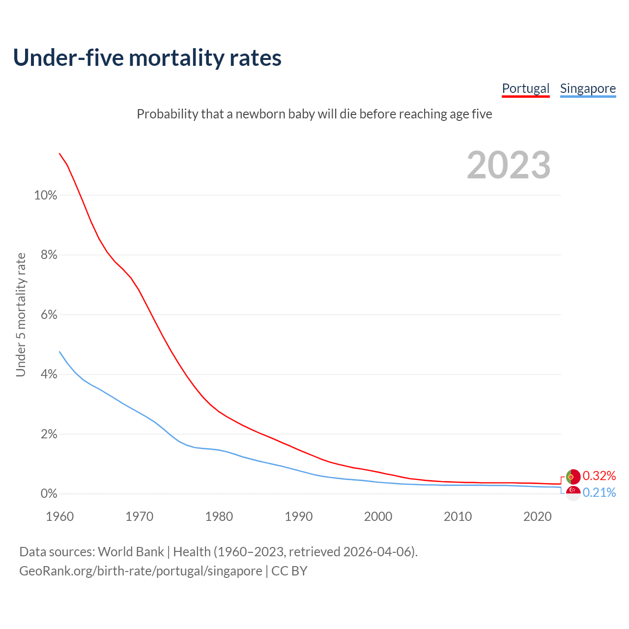 The chance that a newborn baby will die before reaching age five is 0.32% in Portugal and 0.21% in Singapore. Above is a chart with historical data on under-five mortality rates.
