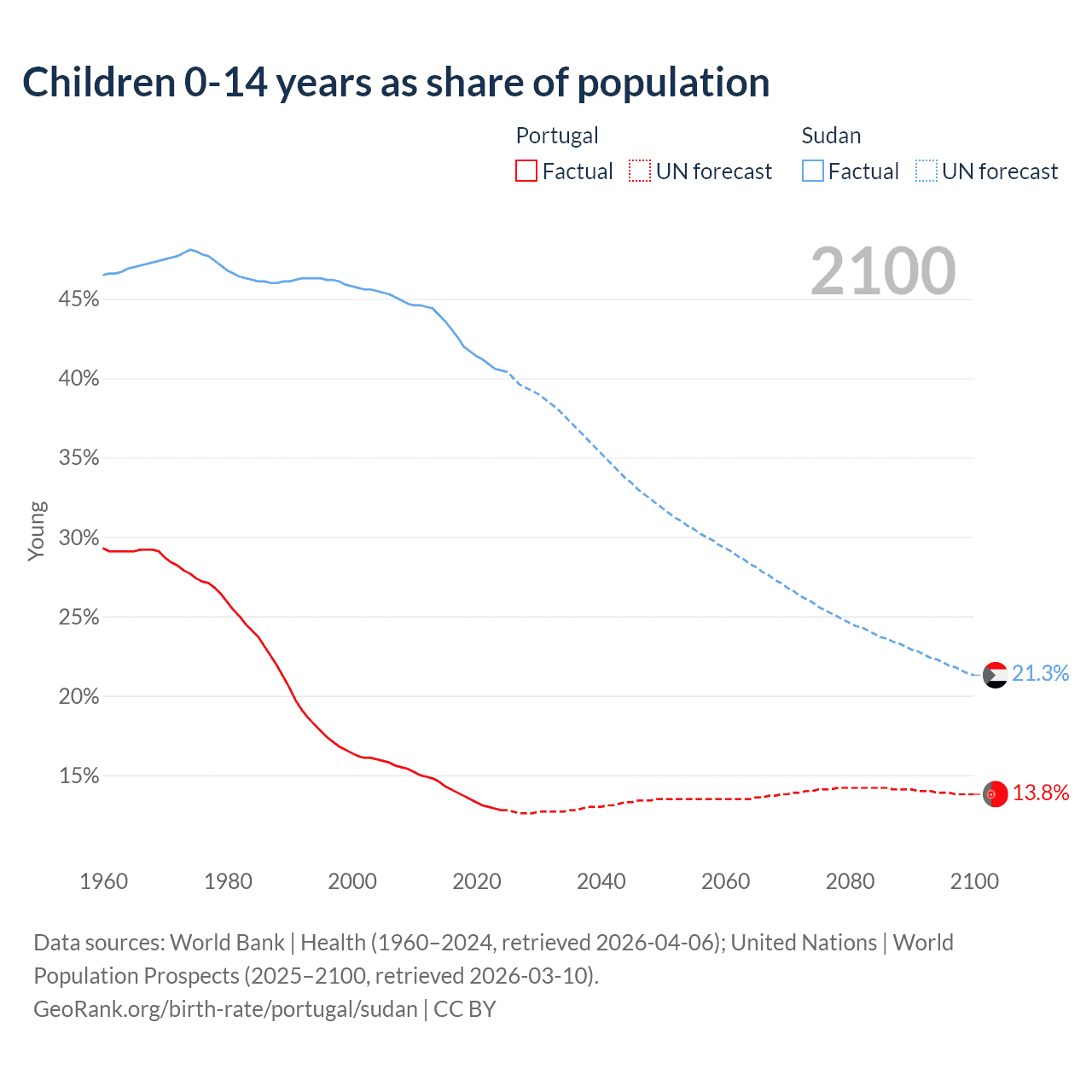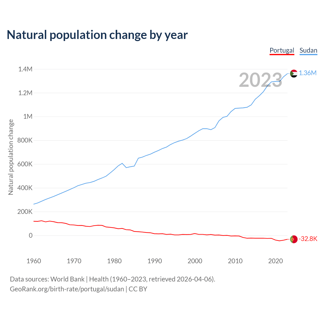 Portugal has an annual birth rate of 8.1 births per 1,000 people, compared to 33.6 for Sudan. The average number of children a woman is expected to have during her lifetime — the fertility rate, is 1.44 in Portugal and 4.32 in Sudan — 200.2% difference.