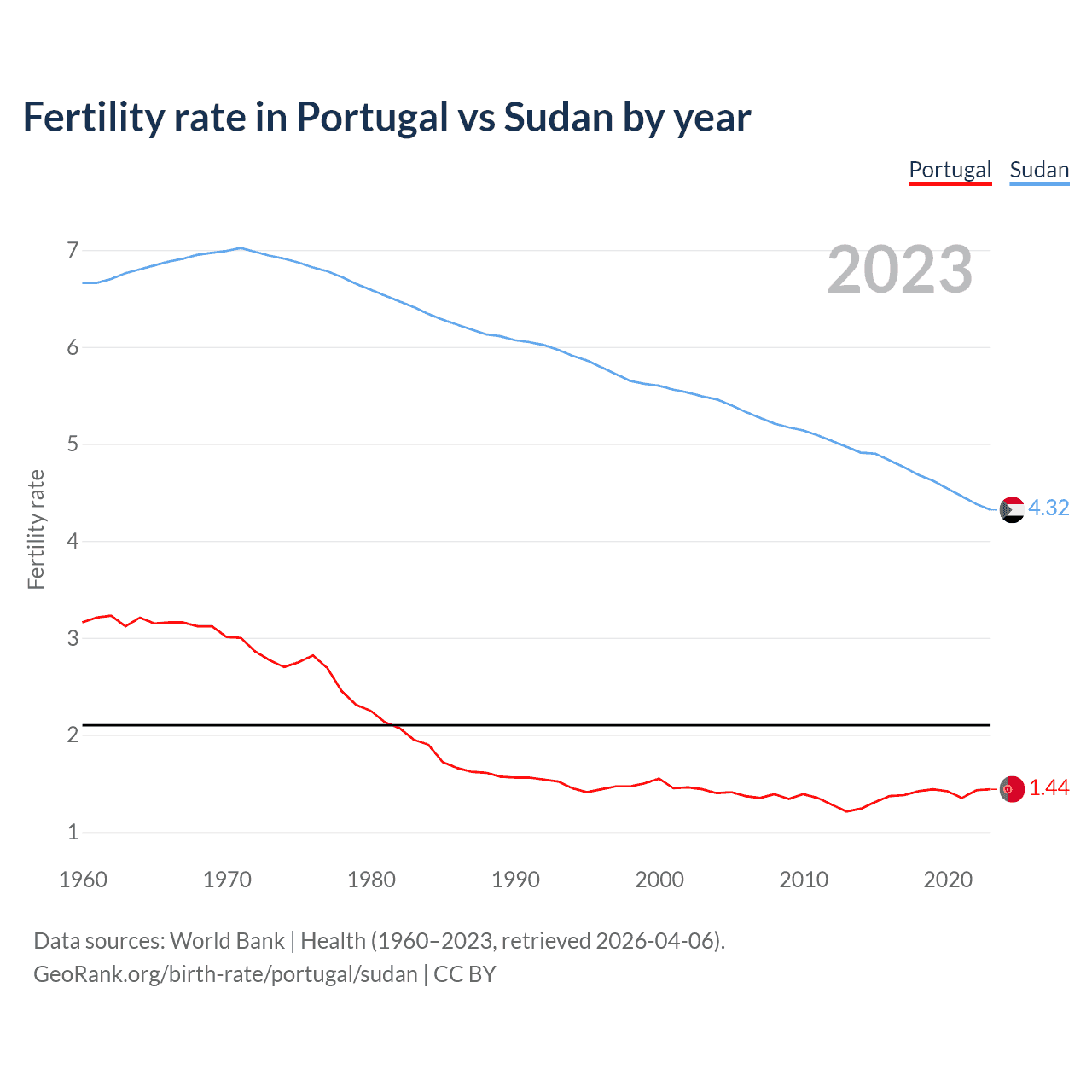 According to the latest available data on birth rates, the fertility rate in Portugal was 1.44 children per woman in 2023, compared to 4.32 in Sudan in 2023. The replacement level is considered to be 2.1 children per woman.