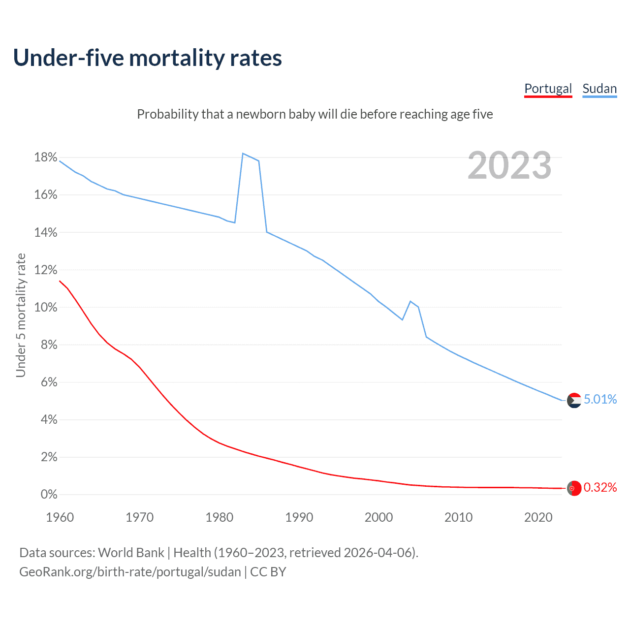 The chance that a newborn baby will die before reaching age five is 0.32% in Portugal and 5.01% in Sudan. Above is a chart with historical data on under-five mortality rates.