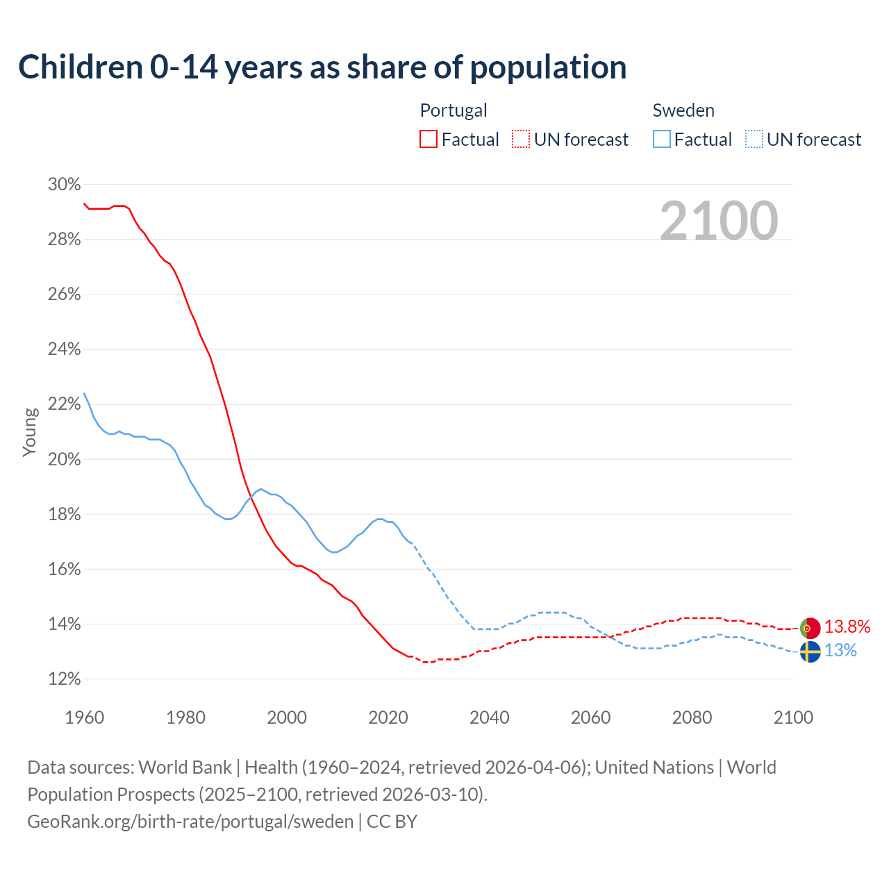 Portugal has an annual birth rate of 8.1 births per 1,000 people, compared to 9.5 for Sweden. The average number of children a woman is expected to have during her lifetime — the fertility rate, is 1.44 in Portugal and 1.45 in Sweden — 0.69% difference.