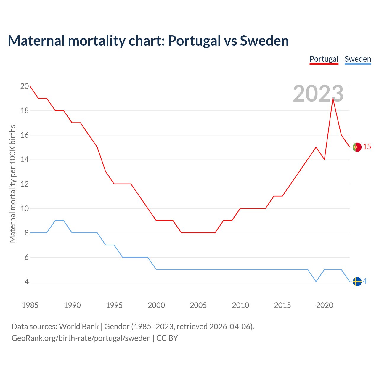 The maternal mortality rate, which is the probability of dying during childbirth or within 42 days of pregnancy termination, is 15 deaths per 100,000 live births in Portugal, compared to 4 deaths in Sweden.