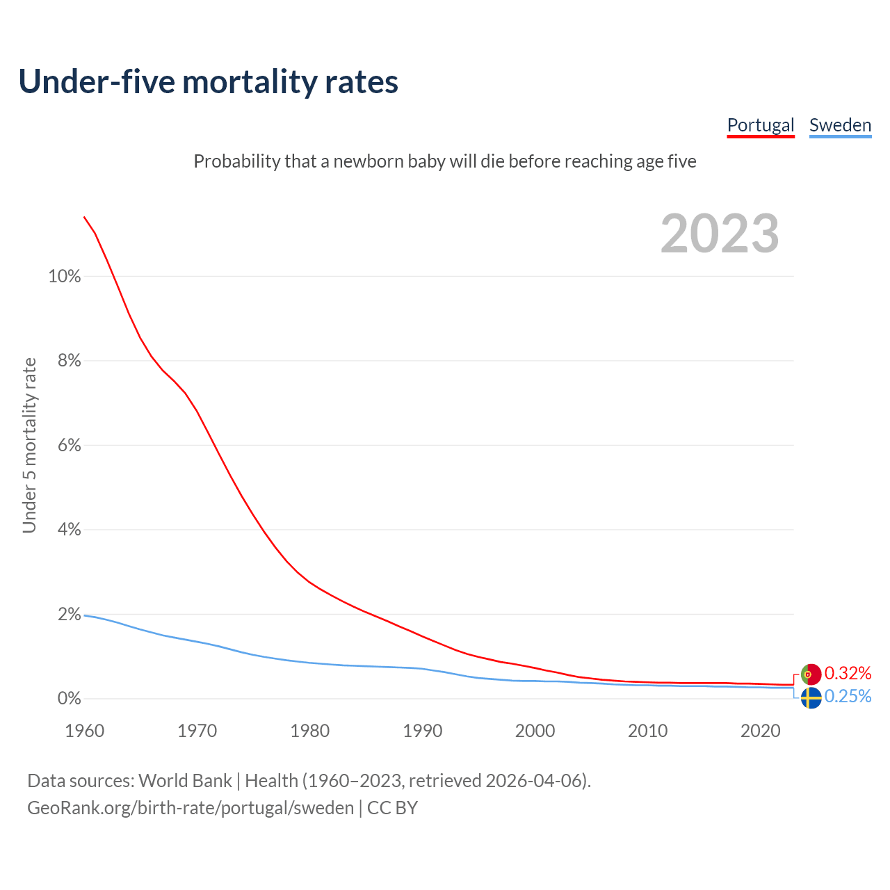 The chance that a newborn baby will die before reaching age five is 0.32% in Portugal and 0.25% in Sweden. Above is a chart with historical data on under-five mortality rates.