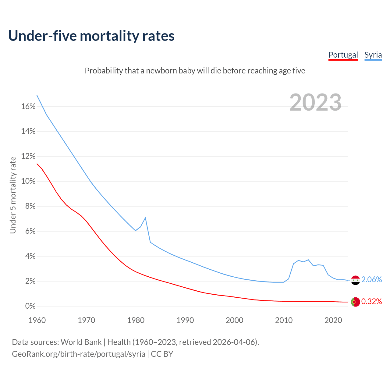 The chance that a newborn baby will die before reaching age five is 0.32% in Portugal and 2.06% in Syria. Above is a chart with historical data on under-five mortality rates.