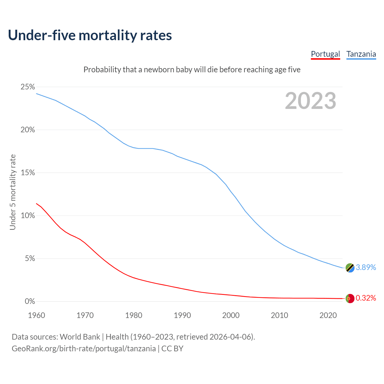 The chance that a newborn baby will die before reaching age five is 0.32% in Portugal and 3.89% in Tanzania. Above is a chart with historical data on under-five mortality rates.