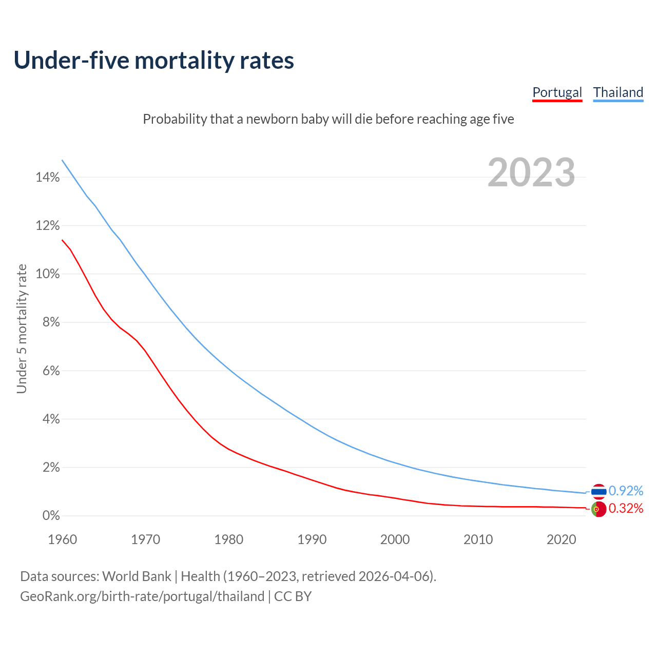 The chance that a newborn baby will die before reaching age five is 0.32% in Portugal and 0.92% in Thailand. Above is a chart with historical data on under-five mortality rates.