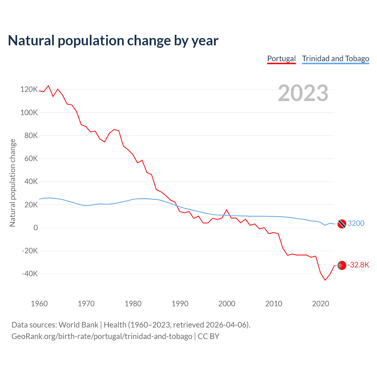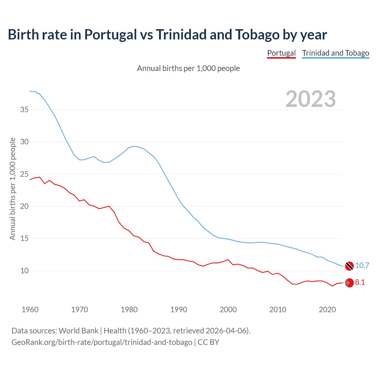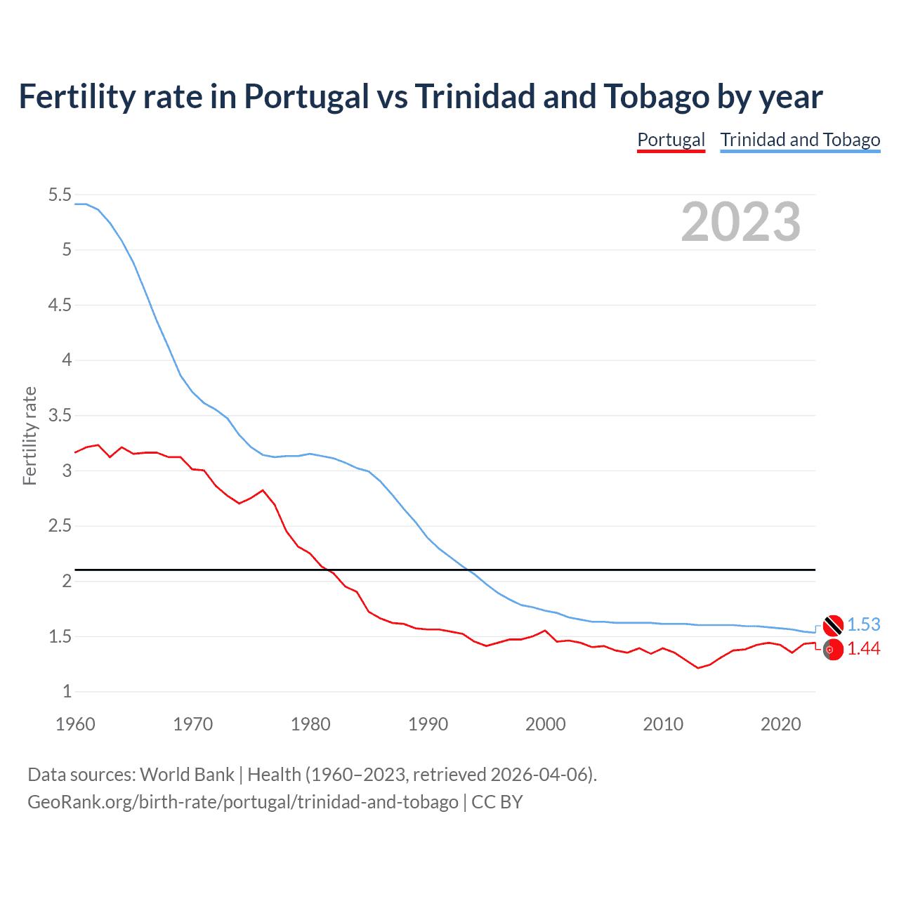 Portugal has an annual birth rate of 8.1 births per 1,000 people, compared to 10.7 for Trinidad and Tobago. The average number of children a woman is expected to have during her lifetime — the fertility rate, is 1.44 in Portugal and 1.53 in Trinidad and Tobago — 6.39% difference.