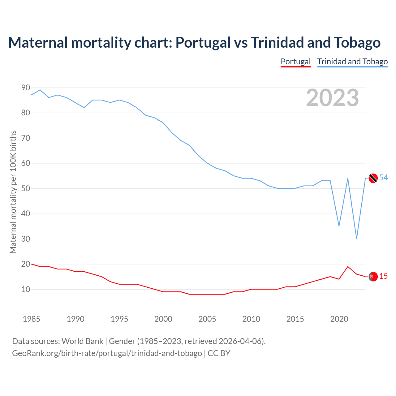 The maternal mortality rate, which is the probability of dying during childbirth or within 42 days of pregnancy termination, is 15 deaths per 100,000 live births in Portugal, compared to 54 deaths in Trinidad and Tobago.