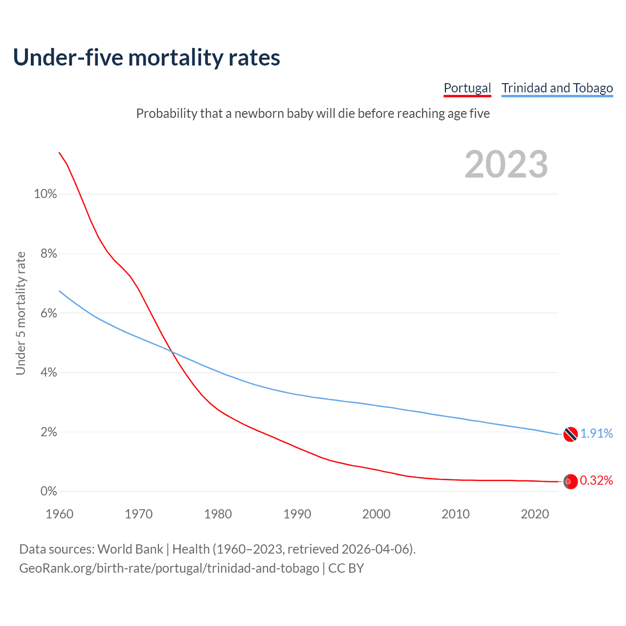 The chance that a newborn baby will die before reaching age five is 0.32% in Portugal and 1.91% in Trinidad and Tobago. Above is a chart with historical data on under-five mortality rates.