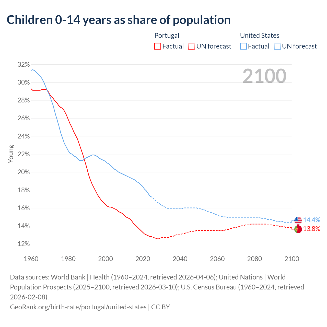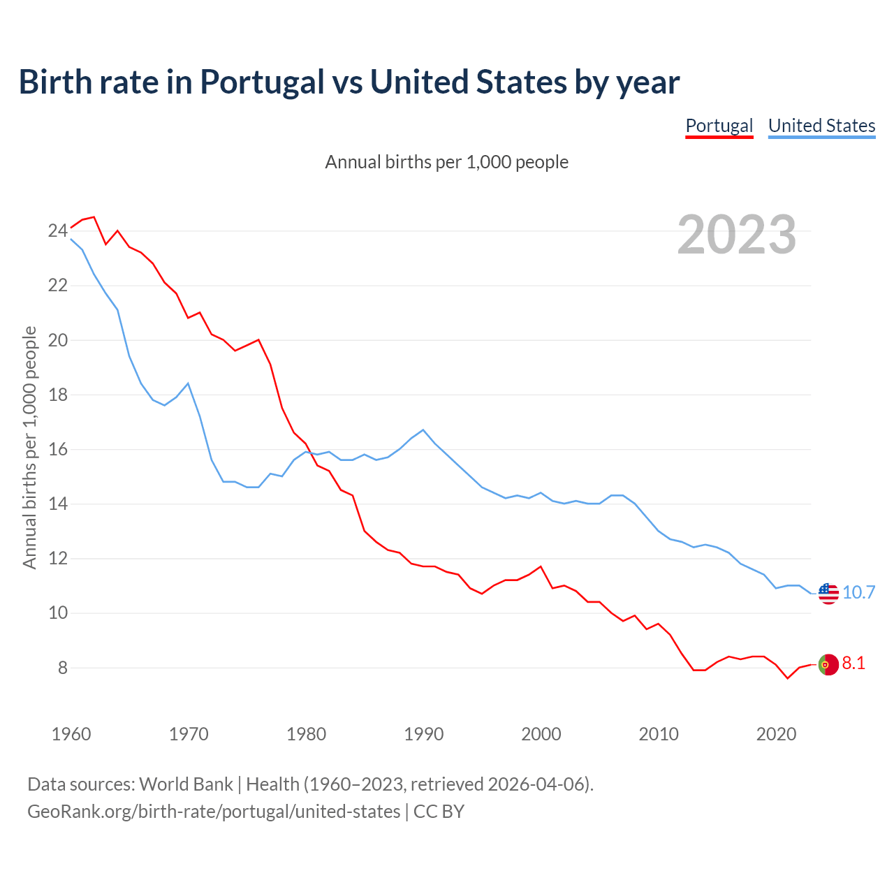 According to the latest available data on birth rates, the fertility rate in Portugal was 1.44 children per woman in 2023, compared to 1.62 in the United States in 2023. The replacement level is considered to be 2.1 children per woman.