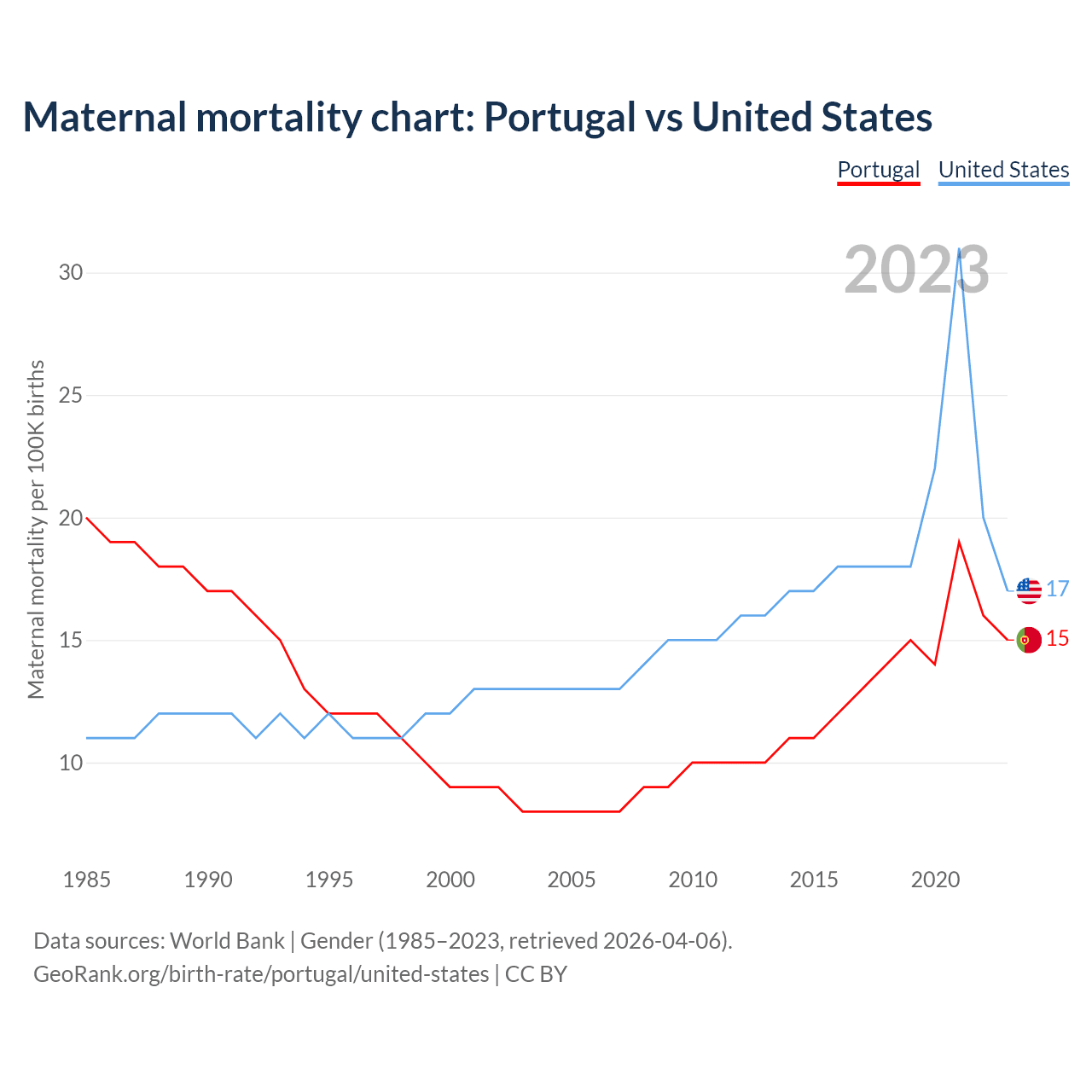 The maternal mortality rate, which is the probability of dying during childbirth or within 42 days of pregnancy termination, is 15 deaths per 100,000 live births in Portugal, compared to 17 deaths in the United States.