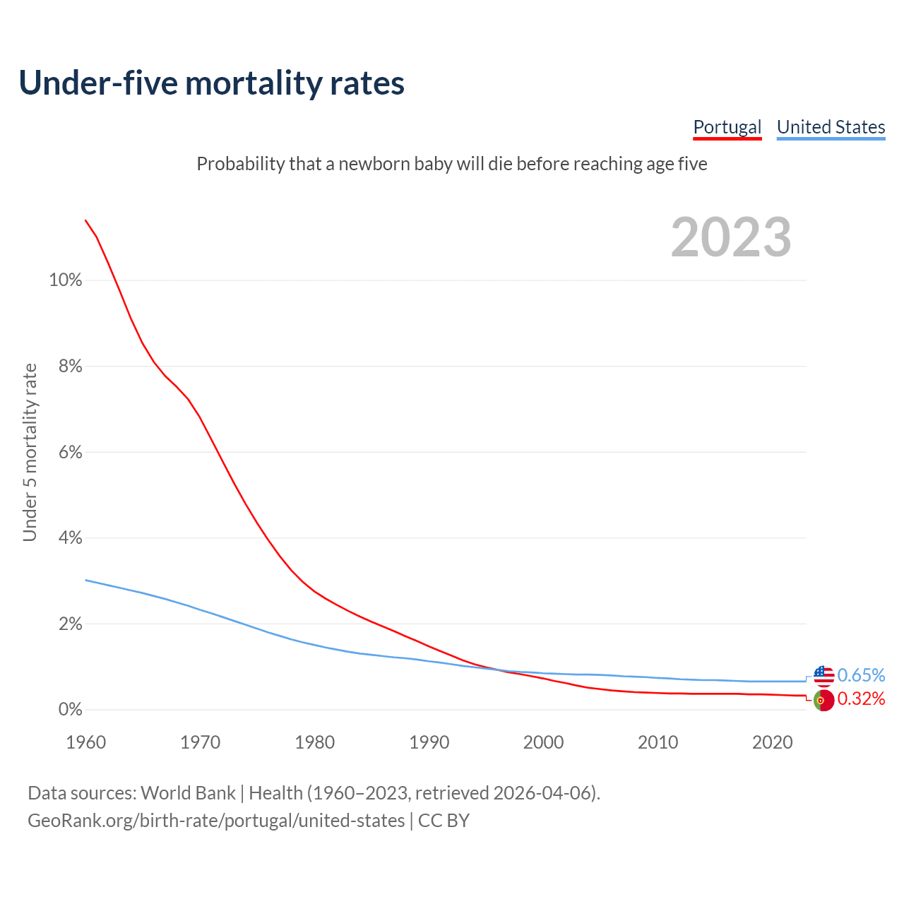 The chance that a newborn baby will die before reaching age five is 0.32% in Portugal and 0.65% in the United States. Above is a chart with historical data on under-five mortality rates.