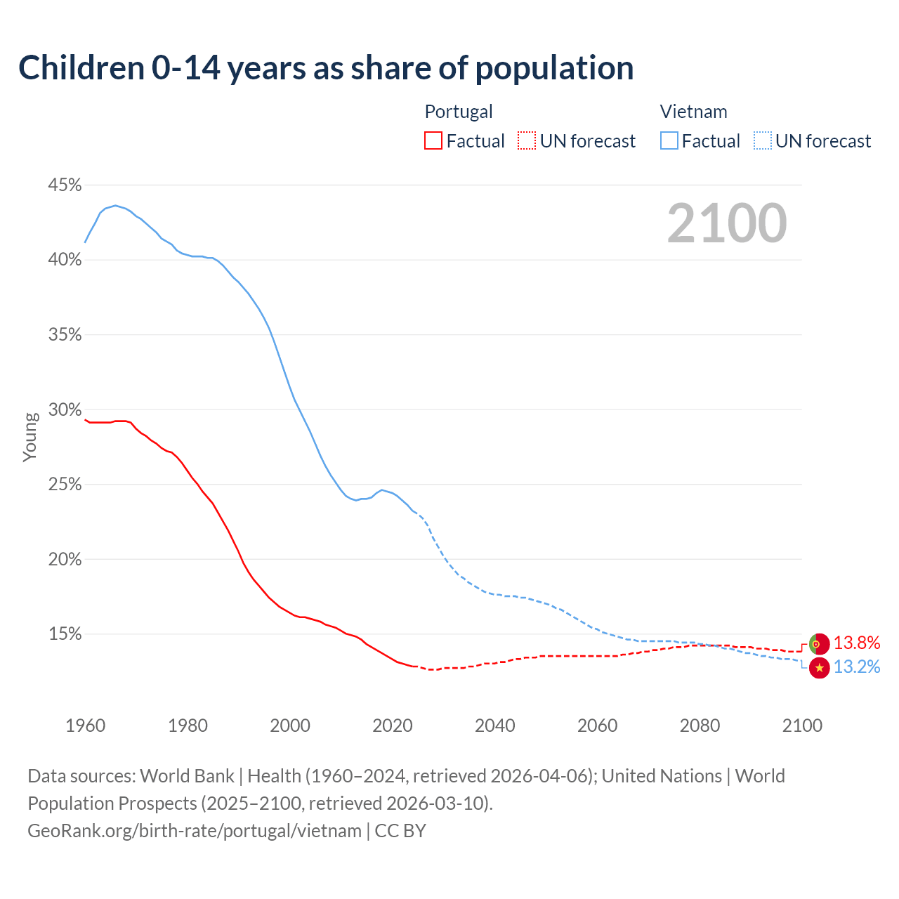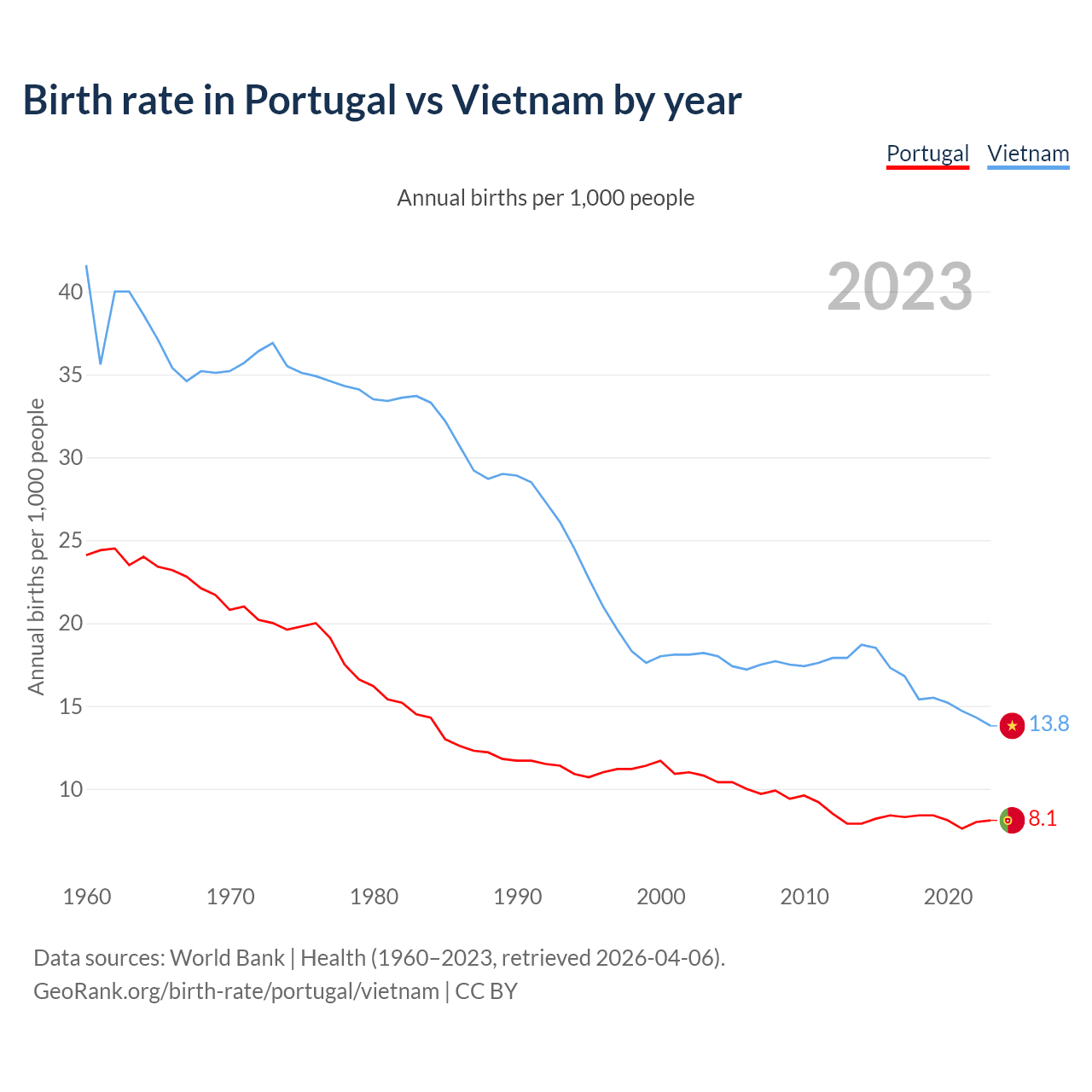 Portugal has an annual birth rate of 8.1 births per 1,000 people, compared to 13.8 for Vietnam. The average number of children a woman is expected to have during her lifetime — the fertility rate, is 1.44 in Portugal and 1.91 in Vietnam — 32.8% difference.