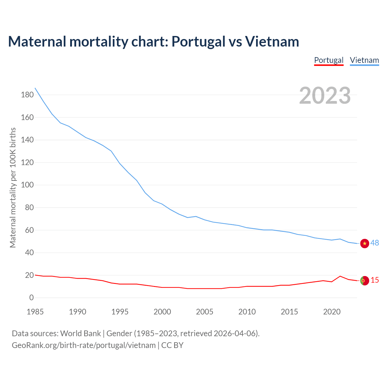 The maternal mortality rate, which is the probability of dying during childbirth or within 42 days of pregnancy termination, is 15 deaths per 100,000 live births in Portugal, compared to 48 deaths in Vietnam.