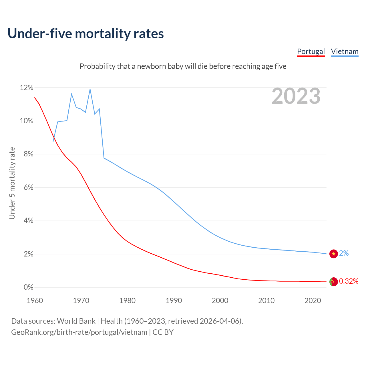 The chance that a newborn baby will die before reaching age five is 0.32% in Portugal and 2% in Vietnam. Above is a chart with historical data on under-five mortality rates.