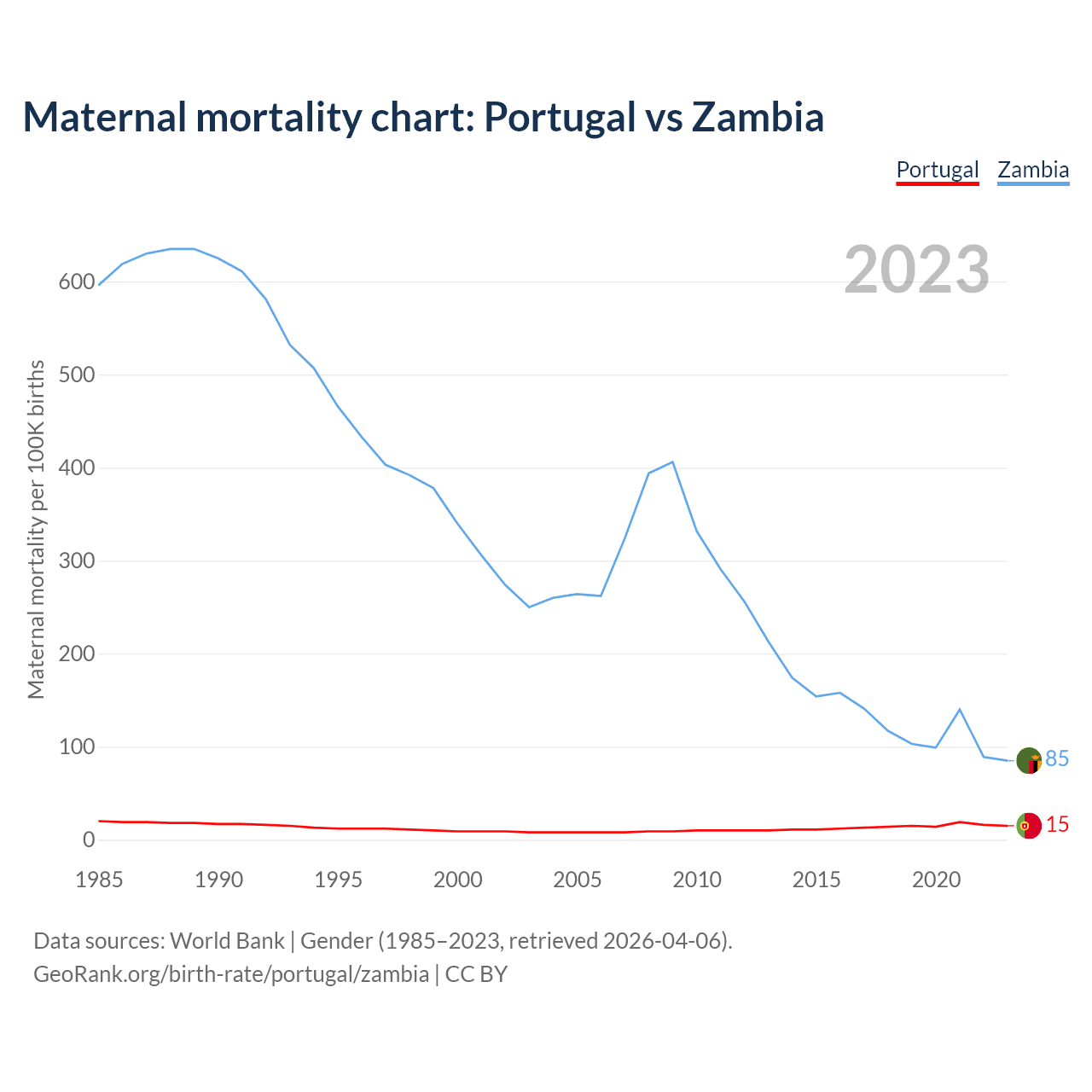 The maternal mortality rate, which is the probability of dying during childbirth or within 42 days of pregnancy termination, is 15 deaths per 100,000 live births in Portugal, compared to 85 deaths in Zambia.