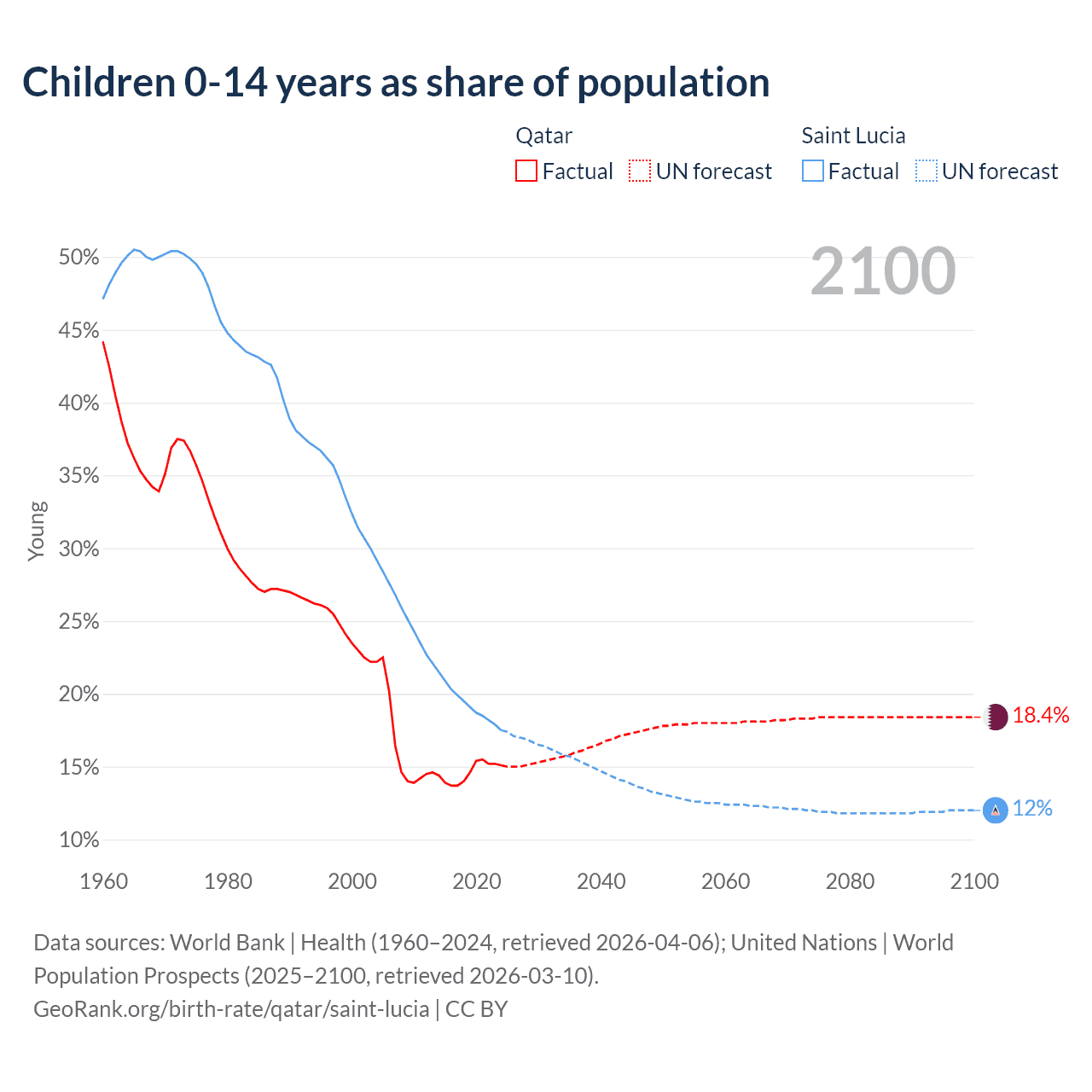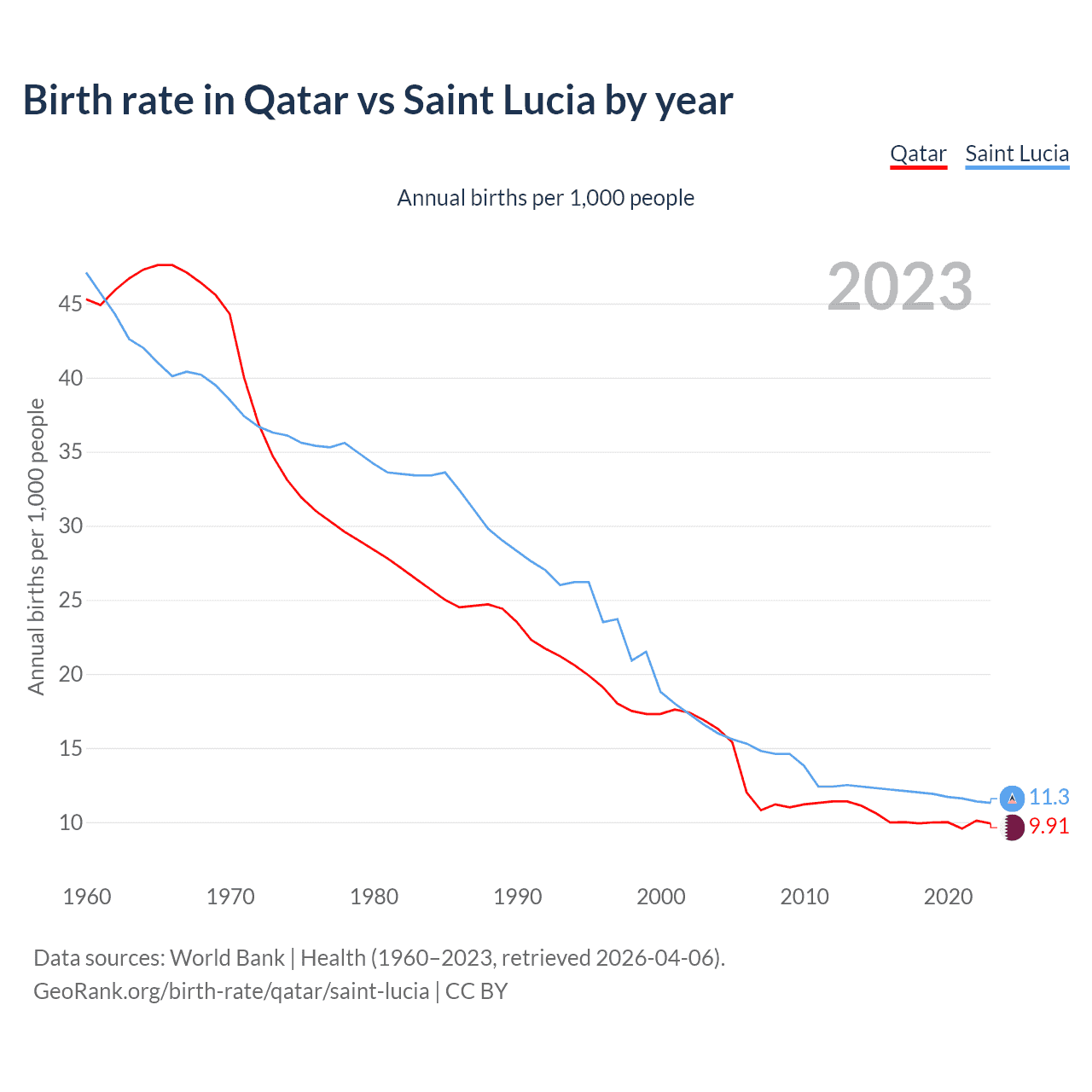 Qatar has an annual birth rate of 9.91 births per 1,000 people, compared to 11.3 for Saint Lucia. The average number of children a woman is expected to have during her lifetime — the fertility rate, is 1.73 in Qatar and 1.38 in Saint Lucia — 20.2% difference.