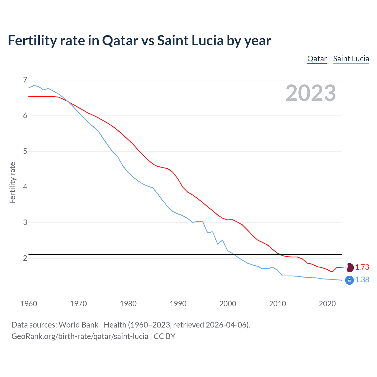 According to the latest available data on birth rates, the fertility rate in Qatar was 1.73 children per woman in 2023, compared to 1.38 in Saint Lucia in 2023. The replacement level is considered to be 2.1 children per woman.