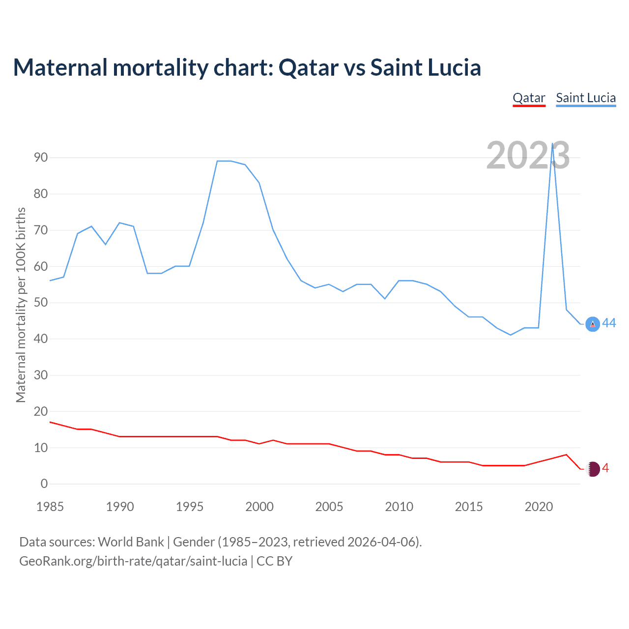 The maternal mortality rate, which is the probability of dying during childbirth or within 42 days of pregnancy termination, is 4 deaths per 100,000 live births in Qatar, compared to 44 deaths in Saint Lucia.