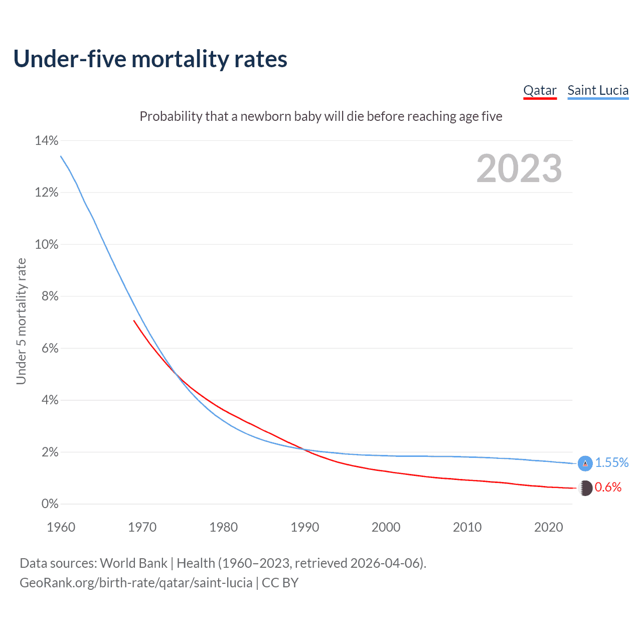 The chance that a newborn baby will die before reaching age five is 0.6% in Qatar and 1.55% in Saint Lucia. Above is a chart with historical data on under-five mortality rates.
