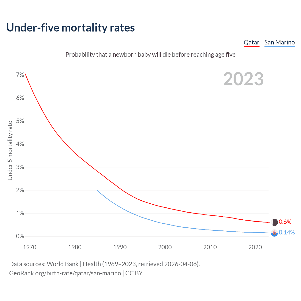 The chance that a newborn baby will die before reaching age five is 0.6% in Qatar and 0.14% in San Marino. Above is a chart with historical data on under-five mortality rates.