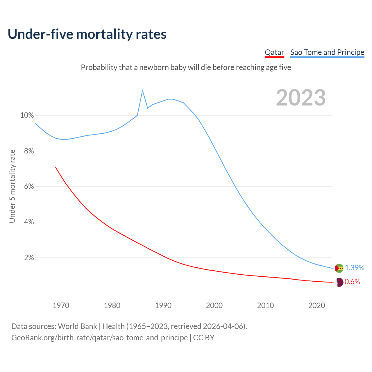 The chance that a newborn baby will die before reaching age five is 0.6% in Qatar and 1.39% in Sao Tome and Principe. Above is a chart with historical data on under-five mortality rates.
