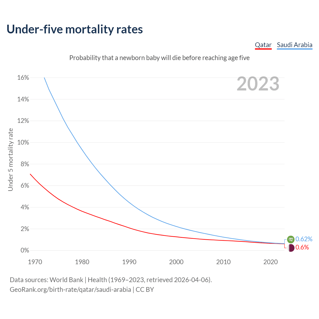 The chance that a newborn baby will die before reaching age five is 0.6% in Qatar and 0.62% in Saudi Arabia. Above is a chart with historical data on under-five mortality rates.