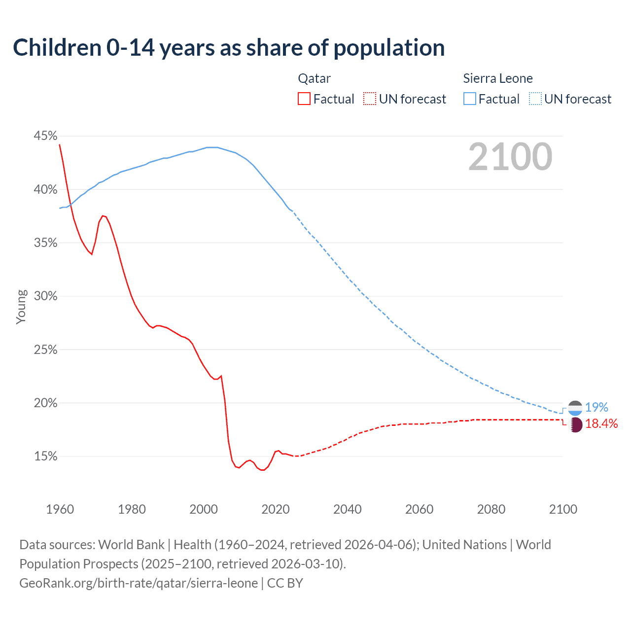 According to the latest available data on birth rates, the fertility rate in Qatar was 1.73 children per woman in 2023, compared to 3.79 in Sierra Leone in 2023. The replacement level is considered to be 2.1 children per woman.